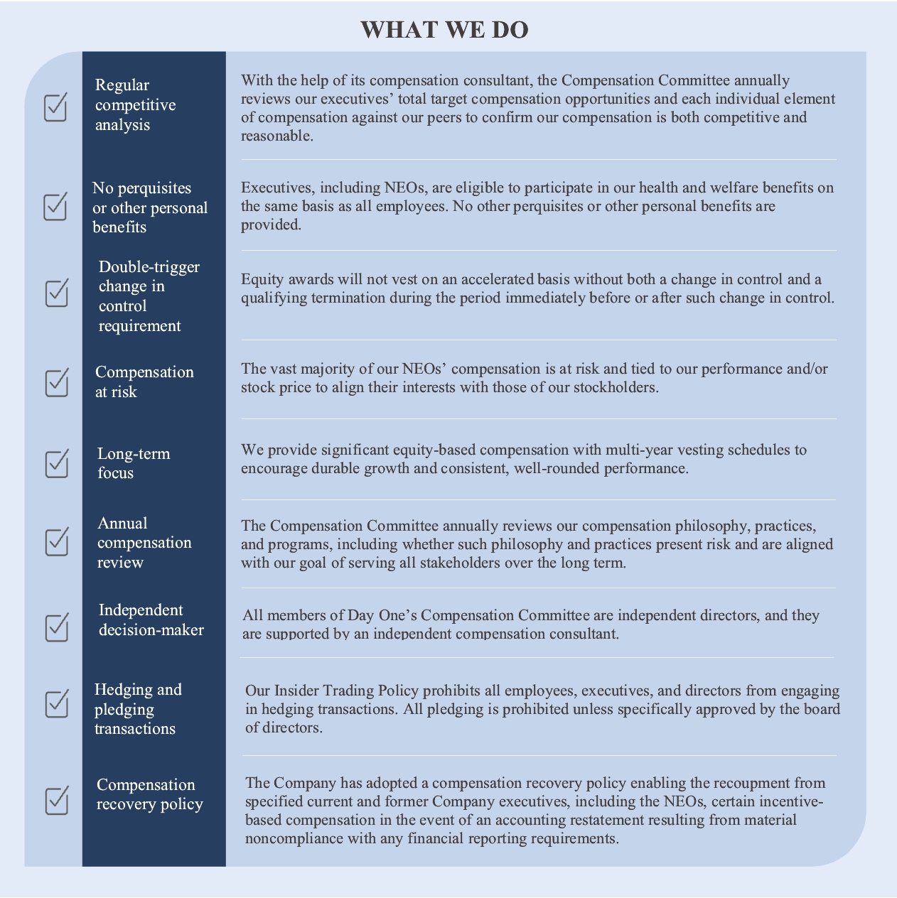 • | Diversity and inclusion. Building a diverse team that functions in an inclusive environment is critical to our success as a global company. We seek to recruit, develop, and retain the most talented people from a diverse candidate pool. Day One is committed to providing an environment of mutual respect where equal employment opportunities are available to all applicants without regard to race, color, religion, sex, pregnancy (including childbirth and related medical conditions), national origin, age, physical and mental disability, marital status, sexual orientation, gender identity, gender expression, genetic information (including characteristics and testing), military and veteran status, and any other characteristic protected by applicable law. Our management team and employees are expected to exhibit and promote honest, ethical and respectful conduct in the workplace. All of our employees must adhere to a code of conduct that sets standards for appropriate behavior and are required to attend biennial training to help prevent, identify, report and stop any type of discrimination and harassment. All recruitment, hiring, development, training, compensation and advancement at our company is based on qualifications, performance, skills and experience without regard to gender, race and ethnicity. |
