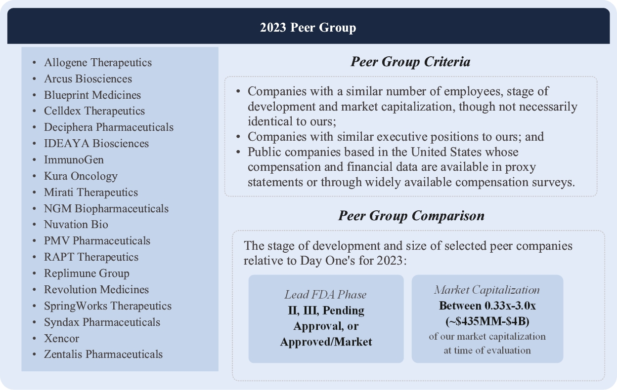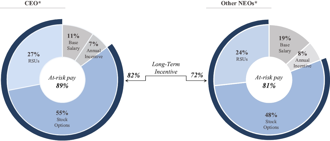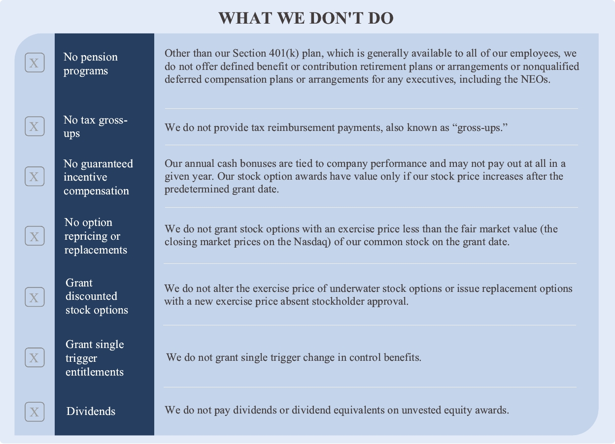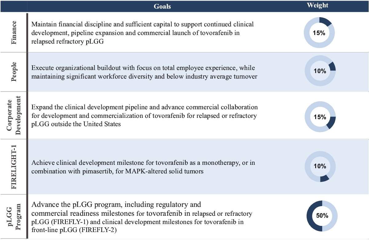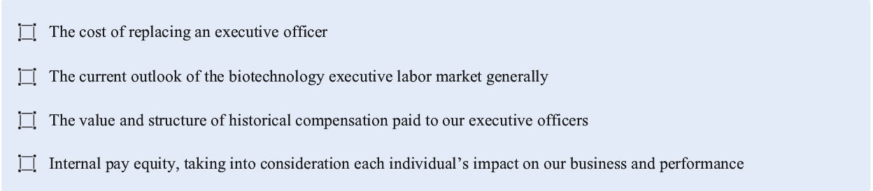 • | Competitive pay and benefits. Drug development is a complex endeavor which requires deep expertise and experience across a broad array of disciplines. Biotechnology and pharmaceutical companies, both large and small, compete for a limited number of qualified applicants to fill specialized positions. We monitor our compensation programs closely and provide what we consider to be a very competitive mix of compensation, insurance and wellness benefits for all our employees, as well as participation in our equity and enhanced maternity and paternity programs. To attract qualified applicants, we offer a total rewards package consisting of base salary and cash target bonus, a comprehensive benefits package and equity compensation for all full-time employees. Bonus opportunity and equity compensation increase as a percentage of total compensation based on level of responsibility. Actual bonus payout is based on company and individual performance. |