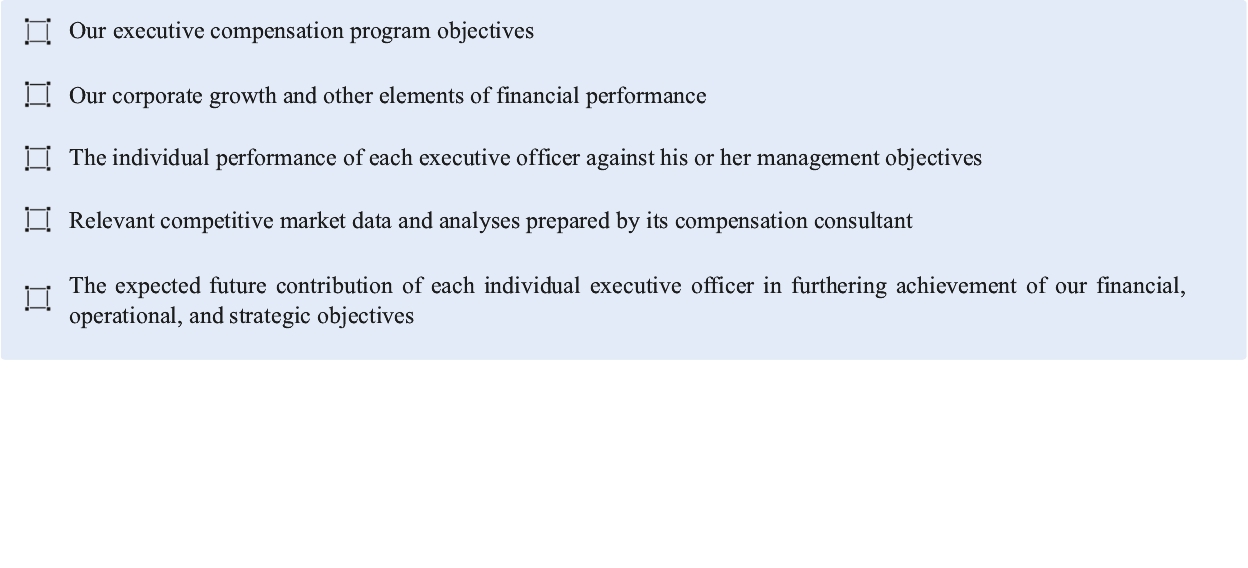 We are asking our stockholders to approve, on a non-binding advisory basis, the compensation of our named executive officers. Additional information about the advisory vote on the compensation of our named executive officers can be found under the section titled “Proposal No. 3 Advisory Vote on the Compensation of Our Named Executive Officers.” | | ||||||||