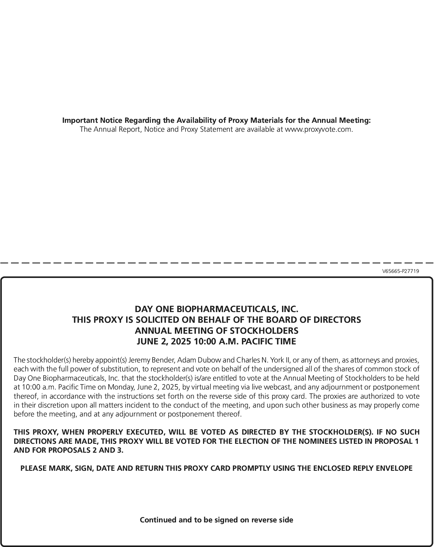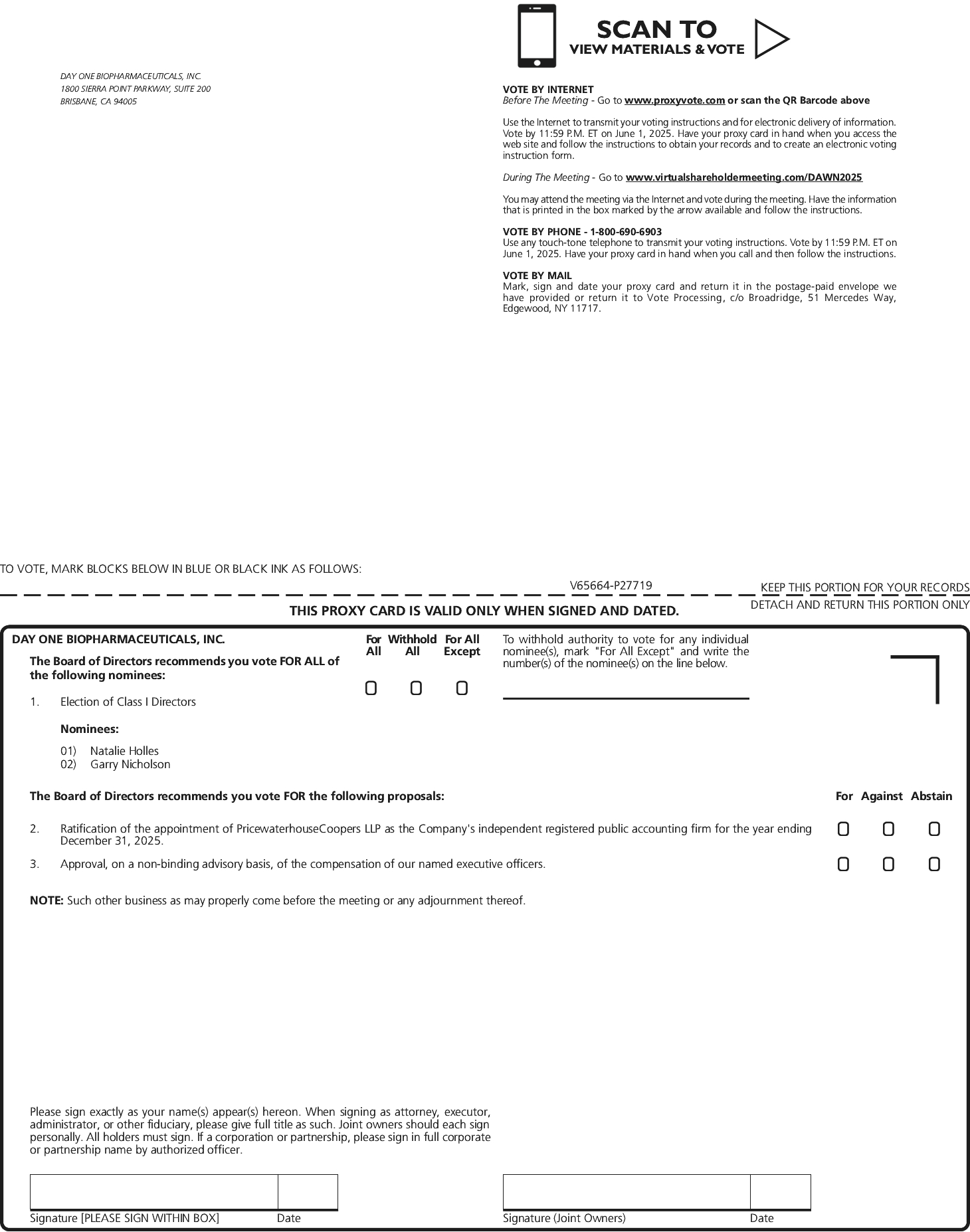 • | If you wish to submit a question during the Annual Meeting, log into the virtual meeting platform at www.virtualshareholdermeeting.com/DAWN2025, type your question into the “Ask a Question” field, and click “Submit.” If your question is properly submitted during the relevant portion of the meeting agenda, we will respond to your question during the live webcast, subject to time constraints. Questions that are substantially similar may be grouped and answered together to avoid repetition. We reserve the right to exclude questions that are irrelevant to meeting matters, irrelevant to the business of Day One, or derogatory or in bad taste; that relate to pending or threatened litigation; that are personal grievances; or that are otherwise inappropriate (as determined by the chair of the Annual Meeting). |