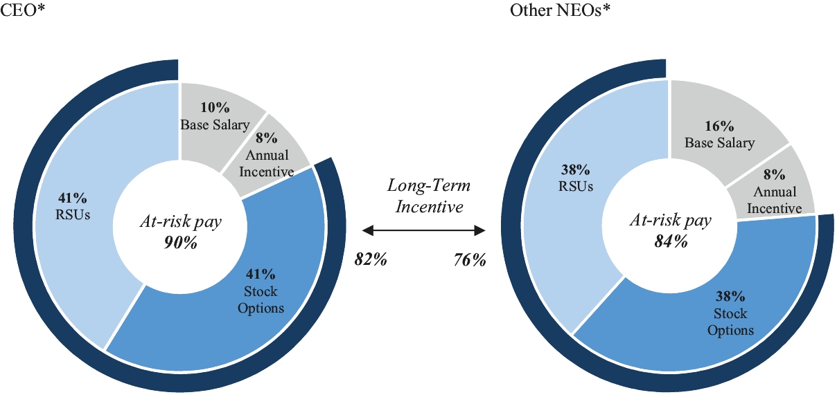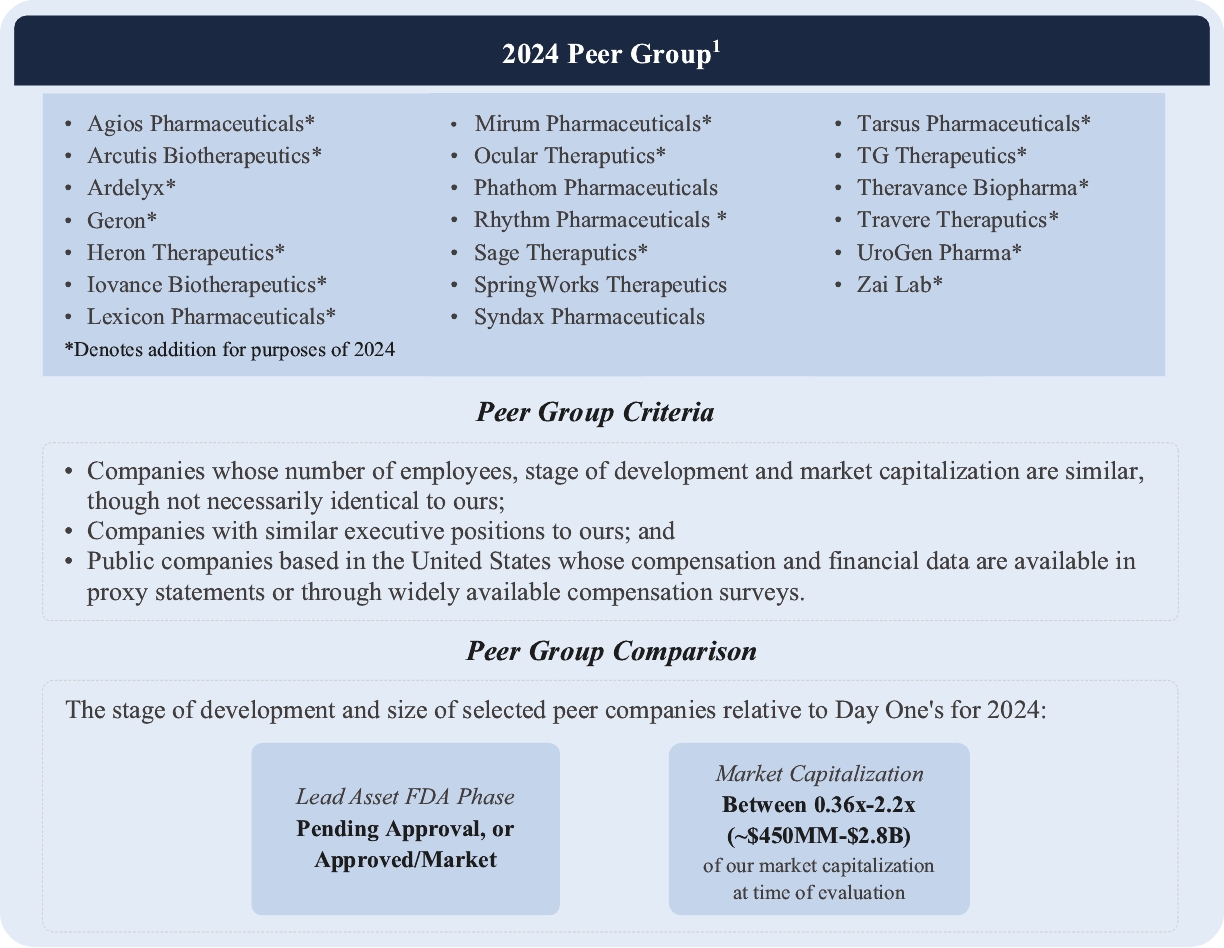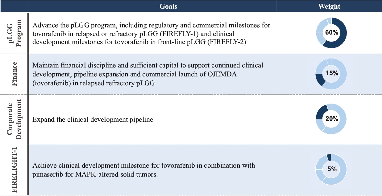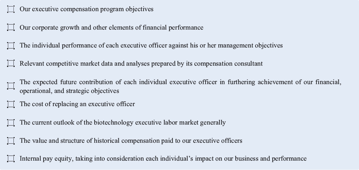 • | Competitive pay and benefits. Drug development is a complex endeavor which requires deep expertise and experience across a broad array of disciplines. Biotechnology and pharmaceutical companies, both large and small, compete for a limited number of qualified applicants to fill specialized positions. We monitor our compensation programs closely and provide what we consider to be a very competitive mix of compensation, insurance and wellness benefits for all our employees, as well as participation in our equity and enhanced maternity and paternity programs. To attract qualified applicants, we offer a total rewards package consisting of base salary and cash target bonus, a comprehensive benefits package and equity compensation for all full-time employees. Bonus opportunity and equity compensation increase as a percentage of total compensation based on level of responsibility. Actual bonus payout is based on company and individual performance. |