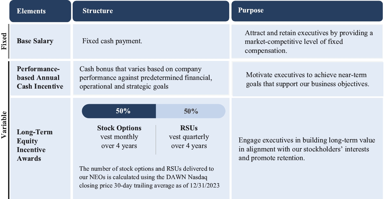 You may vote via the virtual meeting website-any stockholder can attend the Annual Meeting by visiting www.virtualshareholdermeeting.com/DAWN2025, where stockholders may vote and submit questions during the meeting. The meeting starts at 10:00 a.m. Pacific Time. Please have your 16-Digit Control Number to join the Annual Meeting. Instructions on how to attend and participate via the Internet, including how to demonstrate proof of stock ownership, are posted at www.virtualshareholdermeeting.com/DAWN2025. | You may vote by telephone or through the Internet-in order to do so, please follow the instructions shown on your proxy card. | You may vote by mail-if you request or receive a paper proxy card and voting instructions by mail, simply complete, sign and date the enclosed proxy card and promptly return it in the envelope provided or, if the envelope is missing, please mail your completed proxy card to Vote Processing, c/o Broadridge, 51 Mercedes Way, Edgewood, New York 11717. Your completed, signed, and dated proxy card must be received prior to the Annual Meeting. | ||||