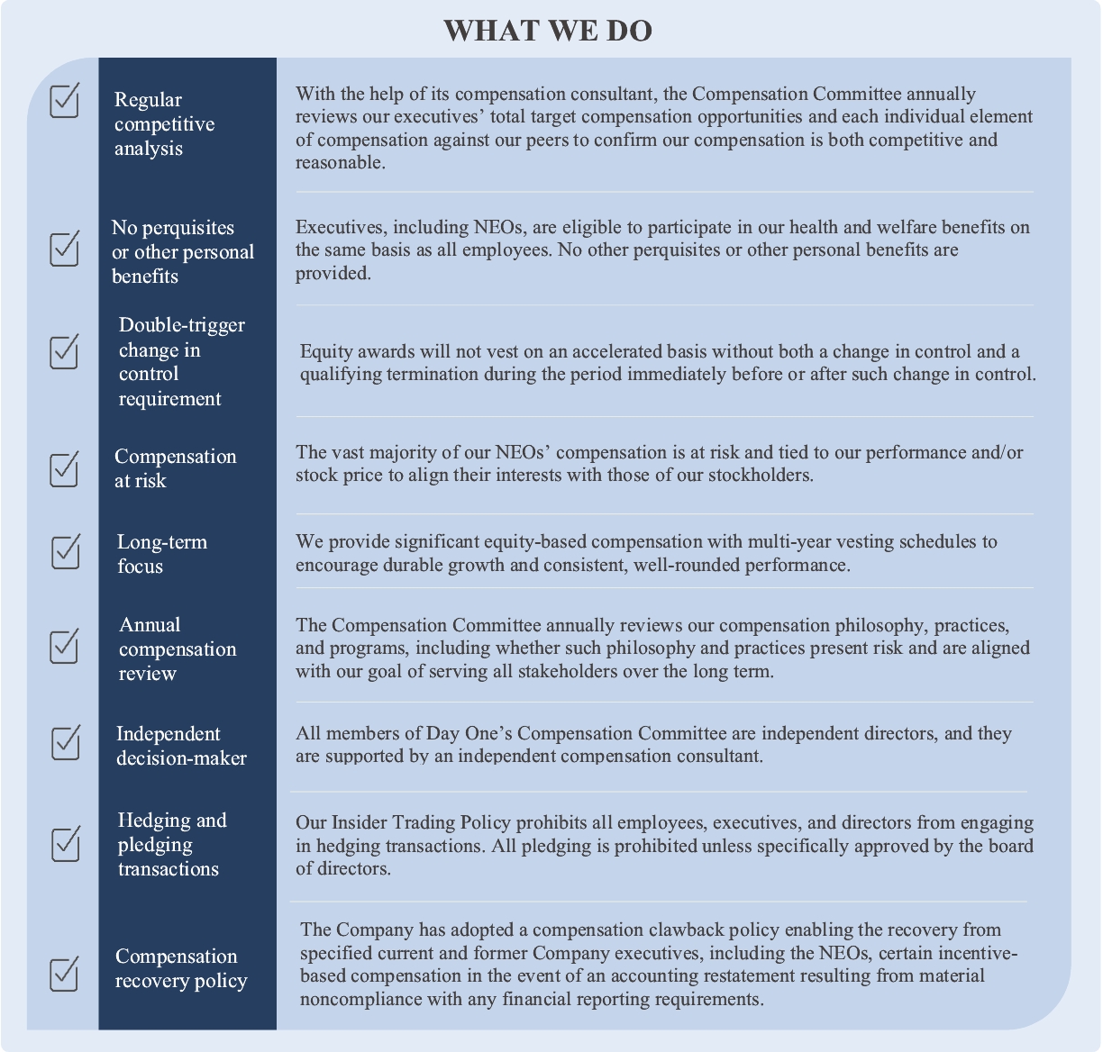 • | Company culture. Building a team of individuals from different backgrounds and with different experiences that functions in an inclusive environment is critical to our success as a global company. We seek to recruit, develop, and retain the most talented people from a diverse candidate pool. Day One is committed to providing an environment of mutual respect where equal employment opportunities are available to all applicants. Our management team and employees are expected to exhibit and promote honest, ethical and respectful conduct in the workplace. All of our employees must adhere to a code of conduct that sets standards for appropriate behavior and are required to attend biennial training to help prevent, identify, report and stop any type of discrimination and harassment. All recruitment, hiring, development, training, compensation and advancement at our company is based on qualifications, performance, skills and experience without regard to gender, race and ethnicity. |