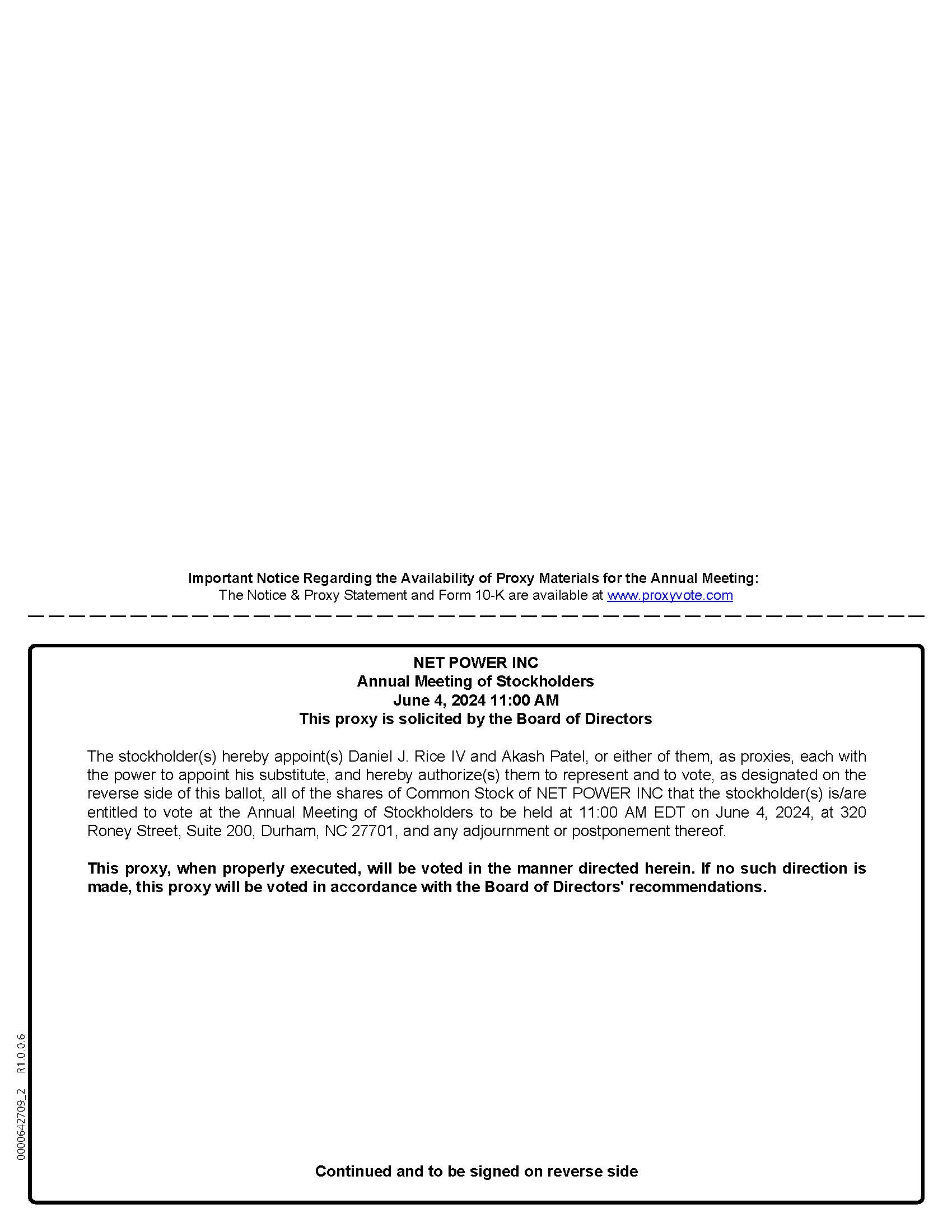 If you would like an additional copy of the 2023 Annual Report or this Proxy Statement, these documents are available in digital form for download or review by visiting www.proxyvote.com. Alternatively, we will promptly send a copy of these documents to you without charge upon request by mail to Investor Relations, NET Power Inc., 320 Roney Street, Suite 200, Durham, North Carolina 27701 or by email to investors@netpower.com.