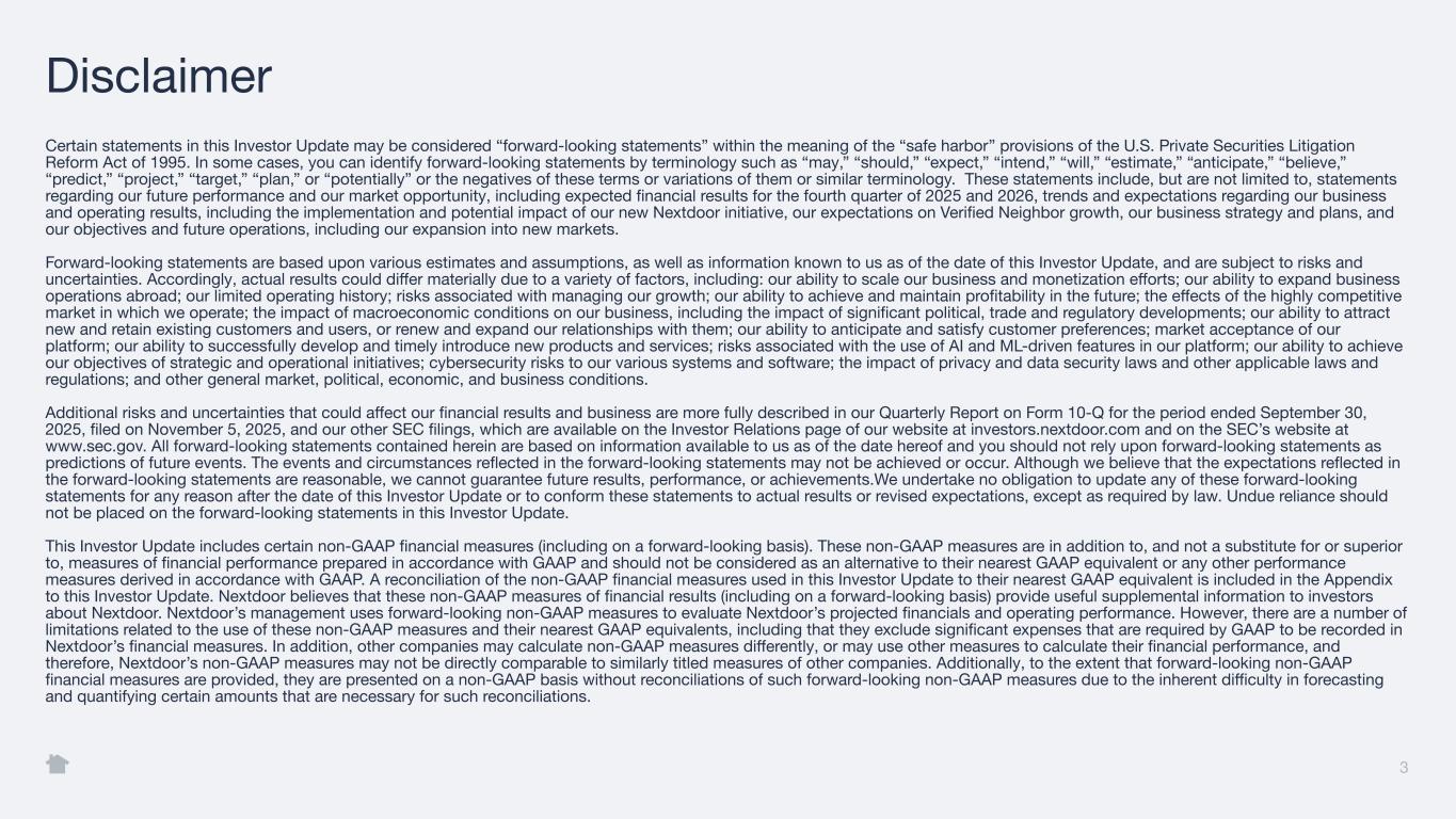 Certain statements in this Investor Update may be considered “forward-looking statements” within the meaning of the “safe harbor” provisions of the U.S. Private Securities Litigation Reform Act of 1995. In some cases, you can identify forward-looking statements by terminology such as “may,” “should,” “expect,” “intend,” “will,” “estimate,” “anticipate,” “believe,” “predict,” “project,” “target,” “plan,” or “potentially” or the negatives of these terms or variations of them or similar terminology. These statements include, but are not limited to, statements regarding our future performance and our market opportunity, including expected financial results for the fourth quarter of 2025 and 2026, trends and expectations regarding our business and operating results, including the implementation and potential impact of our new Nextdoor initiative, our expectations on Verified Neighbor growth, our business strategy and plans, and our objectives and future operations, including our expansion into new markets. Forward-looking statements are based upon various estimates and assumptions, as well as information known to us as of the date of this Investor Update, and are subject to risks and uncertainties. Accordingly, actual results could differ materially due to a variety of factors, including: our ability to scale our business and monetization efforts; our ability to expand business operations abroad; our limited operating history; risks associated with managing our growth; our ability to achieve and maintain profitability in the future; the effects of the highly competitive market in which we operate; the impact of macroeconomic conditions on our business, including the impact of significant political, trade and regulatory developments; our ability to attract new and retain existing customers and users, or renew and expand our relationships with them; our ability to anticipate and satisfy customer preferences; market acceptance of our platform; our ability to successfully develop and timely introduce new products and services; risks associated with the use of AI and ML-driven features in our platform; our ability to achieve our objectives of strategic and operational initiatives; cybersecurity risks to our various systems and software; the impact of privacy and data security laws and other applicable laws and regulations; and other general market, political, economic, and business conditions. Additional risks and uncertainties that could affect our financial results and business are more fully described in our Quarterly Report on Form 10-Q for the period ended September 30, 2025, filed on November 5, 2025, and our other SEC filings, which are available on the Investor Relations page of our website at investors.nextdoor.com and on the SEC’s website at www.sec.gov. All forward-looking statements contained herein are based on information available to us as of the date hereof and you should not rely upon forward-looking statements as predictions of future events. The events and circumstances reflected in the forward-looking statements may not be achieved or occur. Although we believe that the expectations reflected in the forward-looking statements are reasonable, we cannot guarantee future results, performance, or achievements.We undertake no obligation to update any of these forward-looking statements for any reason after the date of this Investor Update or to conform these statements to actual results or revised expectations, except as required by law. Undue reliance should not be placed on the forward-looking statements in this Investor Update. This Investor Update includes certain non-GAAP financial measures (including on a forward-looking basis). These non-GAAP measures are in addition to, and not a substitute for or superior to, measures of financial performance prepared in accordance with GAAP and should not be considered as an alternative to their nearest GAAP equivalent or any other performance measures derived in accordance with GAAP. A reconciliation of the non-GAAP financial measures used in this Investor Update to their nearest GAAP equivalent is included in the Appendix to this Investor Update. Nextdoor believes that these non-GAAP measures of financial results (including on a forward-looking basis) provide useful supplemental information to investors about Nextdoor. Nextdoor’s management uses forward-looking non-GAAP measures to evaluate Nextdoor’s projected financials and operating performance. However, there are a number of limitations related to the use of these non-GAAP measures and their nearest GAAP equivalents, including that they exclude significant expenses that are required by GAAP to be recorded in Nextdoor’s financial measures. In addition, other companies may calculate non-GAAP measures differently, or may use other measures to calculate their financial performance, and therefore, Nextdoor’s non-GAAP measures may not be directly comparable to similarly titled measures of other companies. Additionally, to the extent that forward-looking non-GAAP financial measures are provided, they are presented on a non-GAAP basis without reconciliations of such forward-looking non-GAAP measures due to the inherent difficulty in forecasting and quantifying certain amounts that are necessary for such reconciliations. 3 Disclaimer