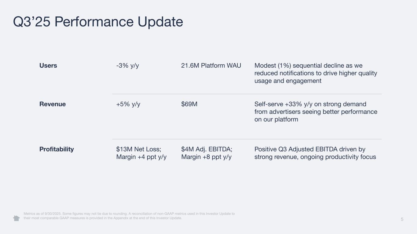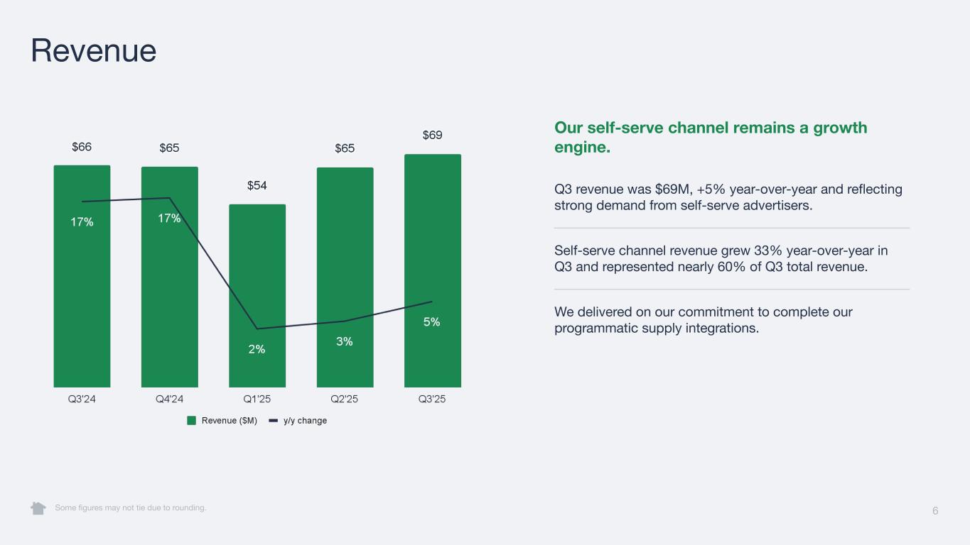 5 Q3’25 Performance Update Users -3% y/y 21.6M Platform WAU Modest (1%) sequential decline as we reduced notifications to drive higher quality usage and engagement Revenue +5% y/y $69M Self-serve +33% y/y on strong demand from advertisers seeing better performance on our platform Profitability $13M Net Loss; Margin +4 ppt y/y $4M Adj. EBITDA; Margin +8 ppt y/y Positive Q3 Adjusted EBITDA driven by strong revenue, ongoing productivity focus Metrics as of 9/30/2025. Some figures may not tie due to rounding. A reconciliation of non-GAAP metrics used in this Investor Update to their most comparable GAAP measures is provided in the Appendix at the end of this Investor Update.