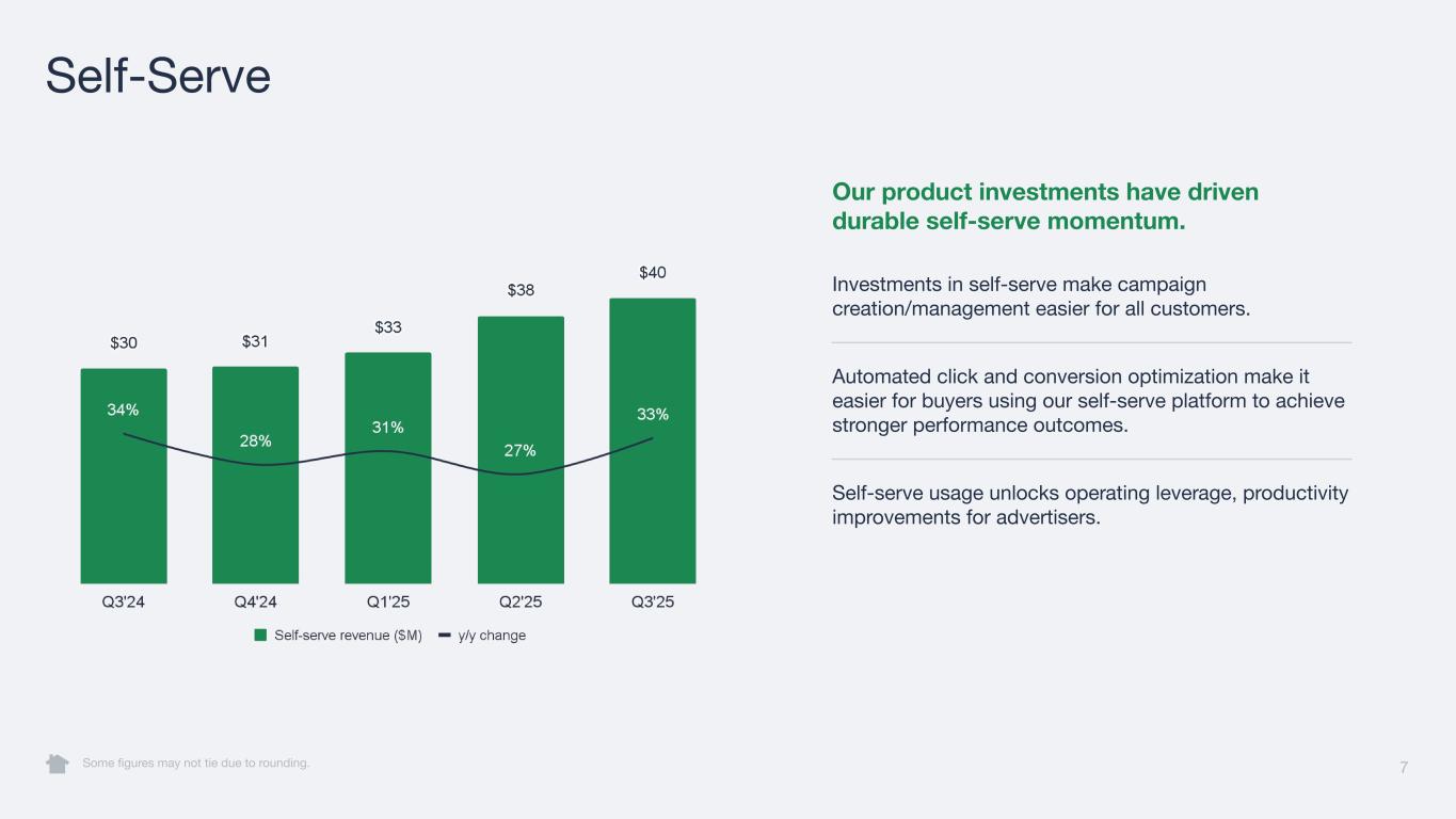 Our self-serve channel remains a growth engine. Q3 revenue was $69M, +5% year-over-year and reflecting strong demand from self-serve advertisers. Self-serve channel revenue grew 33% year-over-year in Q3 and represented nearly 60% of Q3 total revenue. We delivered on our commitment to complete our programmatic supply integrations. 6 Revenue Some figures may not tie due to rounding.
