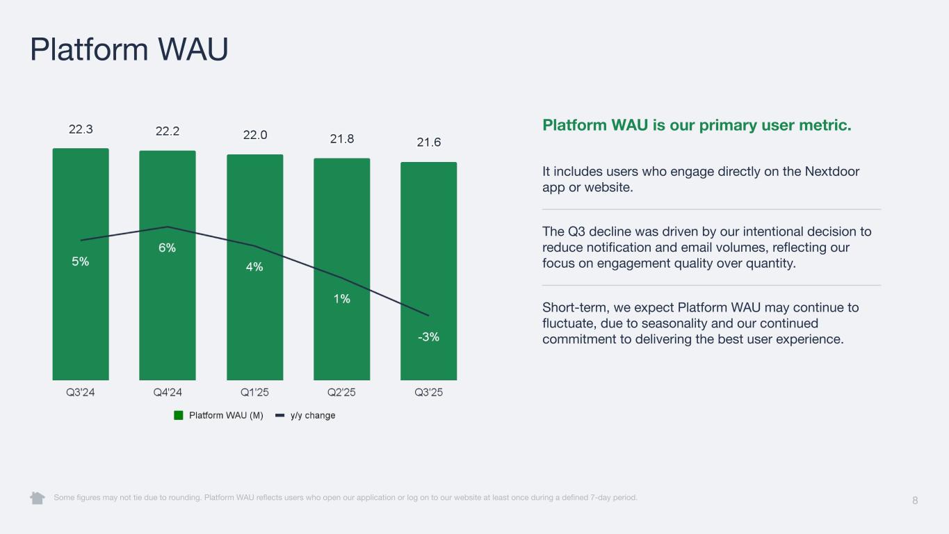 8 Platform WAU Some figures may not tie due to rounding. Platform WAU reflects users who open our application or log on to our website at least once during a defined 7-day period. Platform WAU is our primary user metric. It includes users who engage directly on the Nextdoor app or website. The Q3 decline was driven by our intentional decision to reduce notification and email volumes, reflecting our focus on engagement quality over quantity. Short-term, we expect Platform WAU may continue to fluctuate, due to seasonality and our continued commitment to delivering the best user experience.