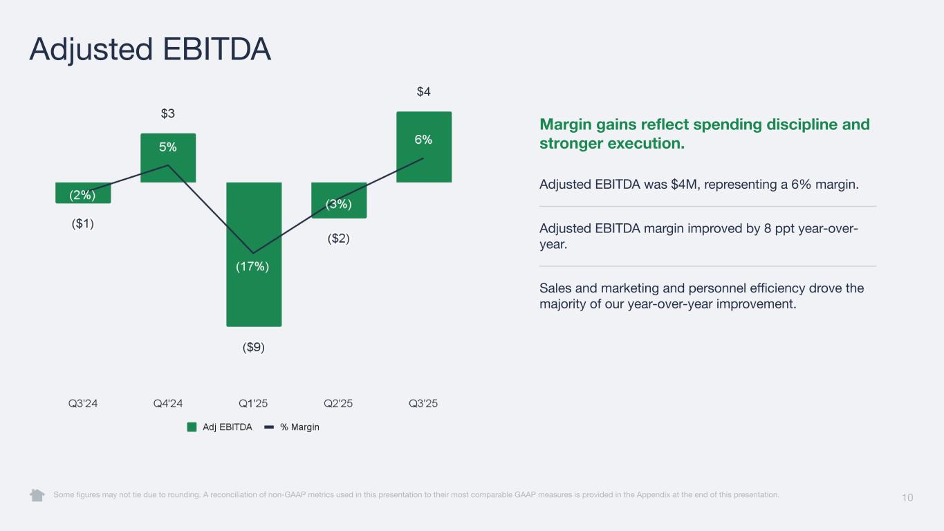 9 Net Income (Loss) Some figures may not tie due to rounding. Operating leverage again improved year-over-year. Net loss and margin were ($13M) and (19%), respectively. Net margin improved by 4 ppt year-over-year. Margin improvement was driven by stronger revenue and slightly lower year-over-year GAAP operating expenses.