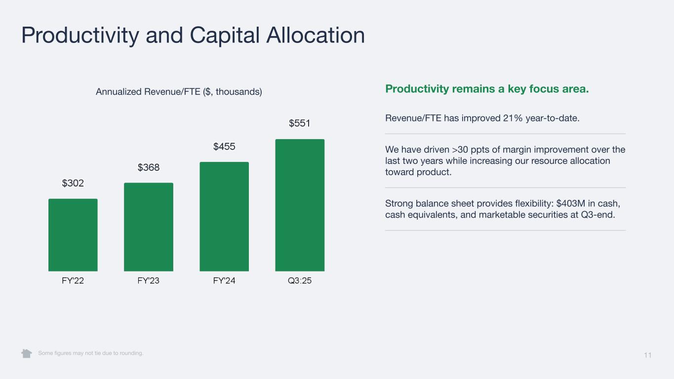10 Adjusted EBITDA Some figures may not tie due to rounding. A reconciliation of non-GAAP metrics used in this presentation to their most comparable GAAP measures is provided in the Appendix at the end of this presentation. Margin gains reflect spending discipline and stronger execution. Adjusted EBITDA was $4M, representing a 6% margin. Adjusted EBITDA margin improved by 8 ppt year-over- year. Sales and marketing and personnel efficiency drove the majority of our year-over-year improvement.