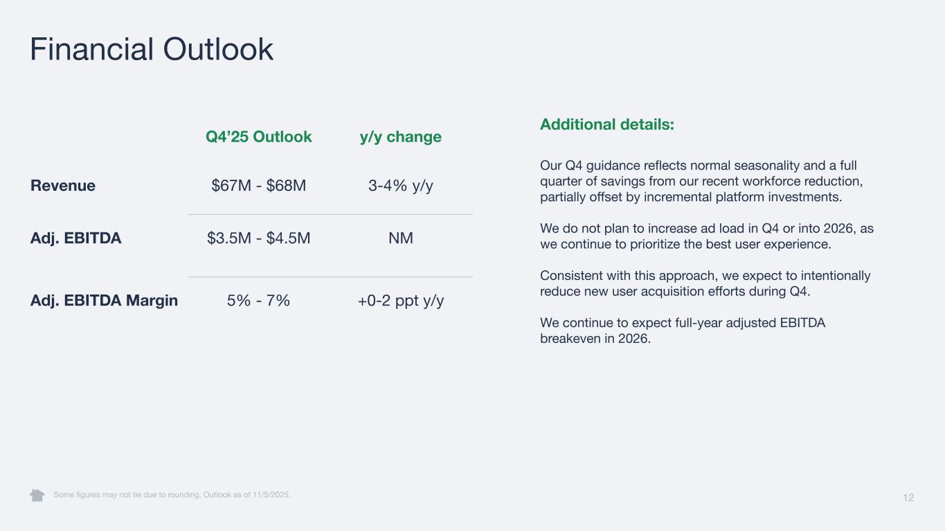 12 Financial Outlook Some figures may not tie due to rounding. Outlook as of 11/5/2025. Q4’25 Outlook y/y change Revenue $67M - $68M 3-4% y/y Adj. EBITDA $3.5M - $4.5M NM Adj. EBITDA Margin 5% - 7% +0-2 ppt y/y Additional details: Our Q4 guidance reflects normal seasonality and a full quarter of savings from our recent workforce reduction, partially offset by incremental platform investments. We do not plan to increase ad load in Q4 or into 2026, as we continue to prioritize the best user experience. Consistent with this approach, we expect to intentionally reduce new user acquisition efforts during Q4. We continue to expect full-year adjusted EBITDA breakeven in 2026.