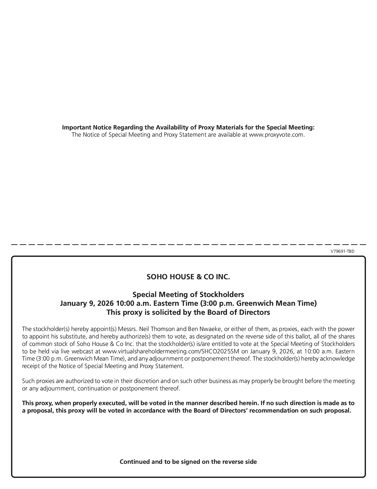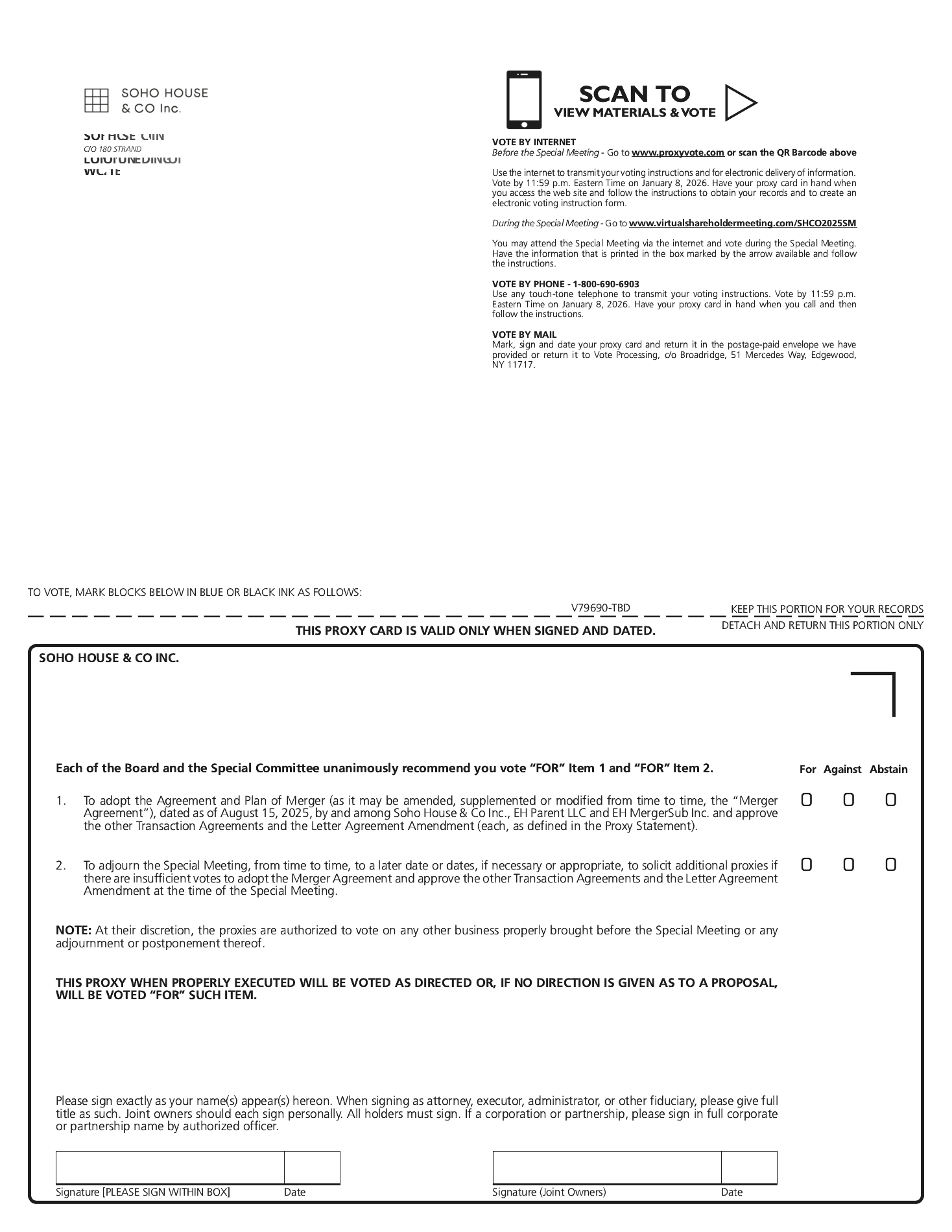 You are cordially invited to attend a special meeting of stockholders (together with any adjournment or postponement thereof, the “Special Meeting”) of Soho House & Co Inc., a Delaware corporation (“Soho House”). The Special Meeting will be held on January 9, 2026 at 10:00 a.m. Eastern Time (3:00 p.m. Greenwich Mean Time). You may virtually attend the Special Meeting via a live webcast at www.virtualshareholdermeeting.com/SHCO2025SM.