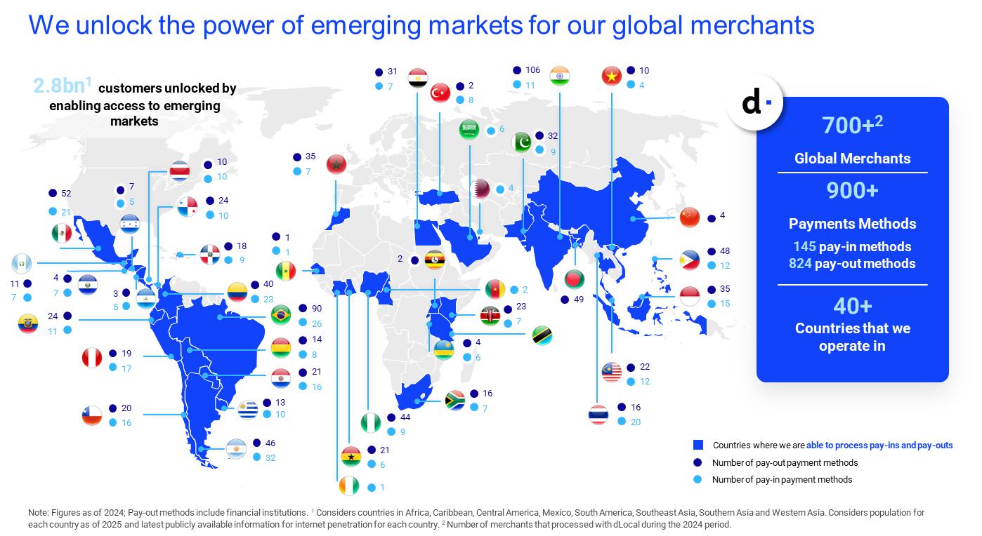 dLocal is focused on simplifying and redefining the online payments experience in emerging markets. Through one API, one technology platform, and one contract, which we collectively refer to as the One dLocal model, we enable global enterprise merchants to get paid (pay-in) and to make payments (pay-out) online in a safe and efficient manner. Merchants on our platform consistently benefit from improved acceptance and conversion rates, reduced friction, and enhanced fraud prevention, which enables merchants to better serve nearly two billion potential combined internet users in the countries we serve. Our proprietary, fully cloud-based platform has the ability to power both cross-border and local-to-local transactions in more than 40 countries as of December 31, 2024. Our solutions are designed to be user-friendly and seamlessly adapted to our different countries and payment methods. We empower global merchants to expand their market reach by connecting them to consumers through more than 145 different local pay-in payment methods and 824 local pay-out payment methods, including financial institutions, across different geographies, as of December 31, 2024. In addition, our proprietary technology architecture is designed to be highly scalable and flexible, enabling us to rapidly innovate in response to market demand, expand our services to new countries, and enhance our value proposition for our merchant clients. We believe that our product offering is the most comprehensive online payments infrastructure currently available for global enterprise merchants operating across emerging markets.