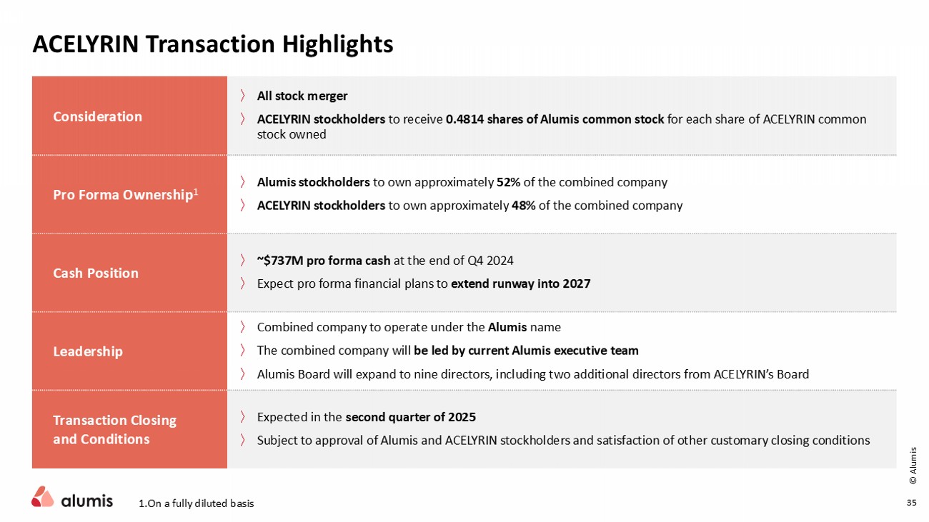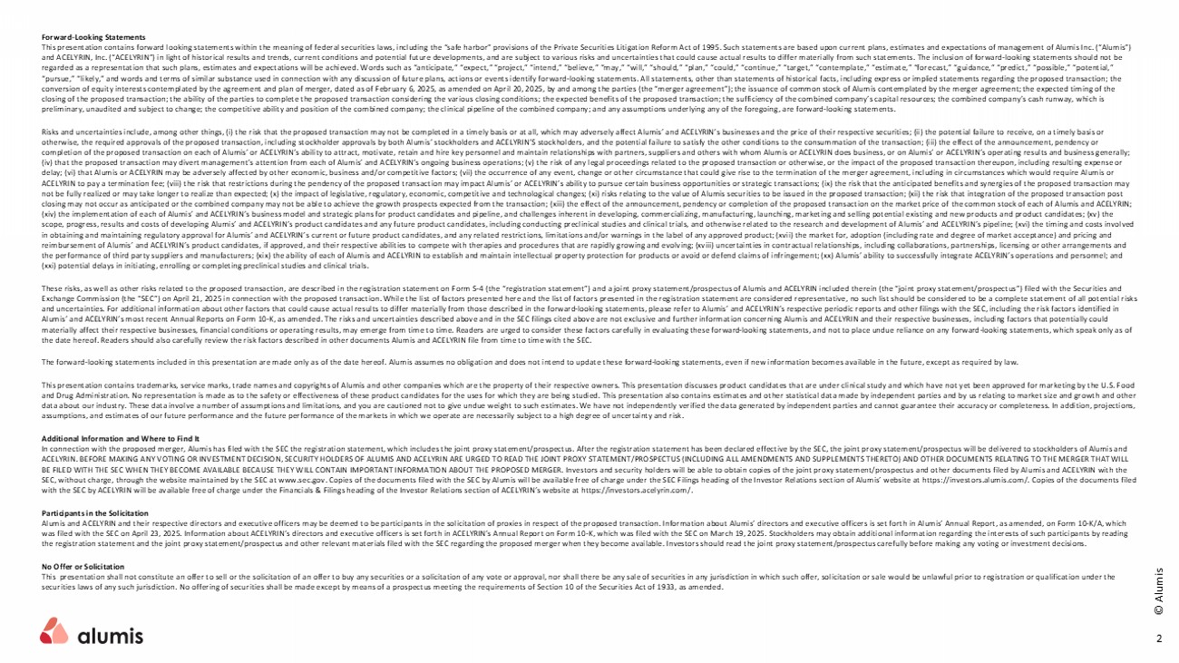 This presentation contains forward looking statements within the meaning of federal securities laws, including the “safe harbor” provisions of the Private Securities Litigation Reform Act of 1995. Such statements are based upon current plans, estimates and expectations of management of Alumis Inc. (“Alumis”) and ACELYRIN, Inc. (“ACELYRIN”) in light of historical results and trends, current conditions and potential future developments, and are subject to various risks and uncertainties that could cause actual results to differ materially from such statements. The inclusion of forward-looking statements should not be regarded as a representation that such plans, estimates and expectations will be achieved. Words such as “anticipate,” “expect,” “project,” “intend,” “believe,” “may,” “will,” “should,” “plan,” “could,” “continue,” “target,” “contemplate,” “estimate,” “forecast,” “guidance,” “predict,” “possible,” “potential,” “pursue,” “likely,” and words and terms of similar substance used in connection with any discussion of future plans, actions or events identify forward-looking statements. All statements, other than statements of historical facts, including express or implied statements regarding the proposed transaction; the conversion of equity interests contemplated by the agreement and plan of merger, dated as of February 6, 2025, as amended on April 20, 2025, by and among the parties (the “merger agreement”); the issuance of common stock of Alumis contemplated by the merger agreement; the expected timing of the closing of the proposed transaction; the ability of the parties to complete the proposed transaction considering the various closing conditions; the expected benefits of the proposed transaction; the sufficiency of the combined company’s capital resources; the combined company’s cash runway, which is preliminary, unaudited and subject to change; the competitive ability and position of the combined company; the clinical pipeline of the combined company; and any assumptions underlying any of the foregoing, are forward-looking statements.