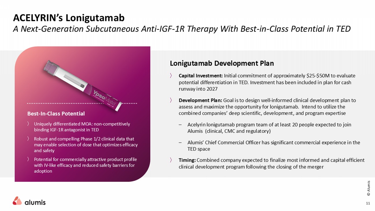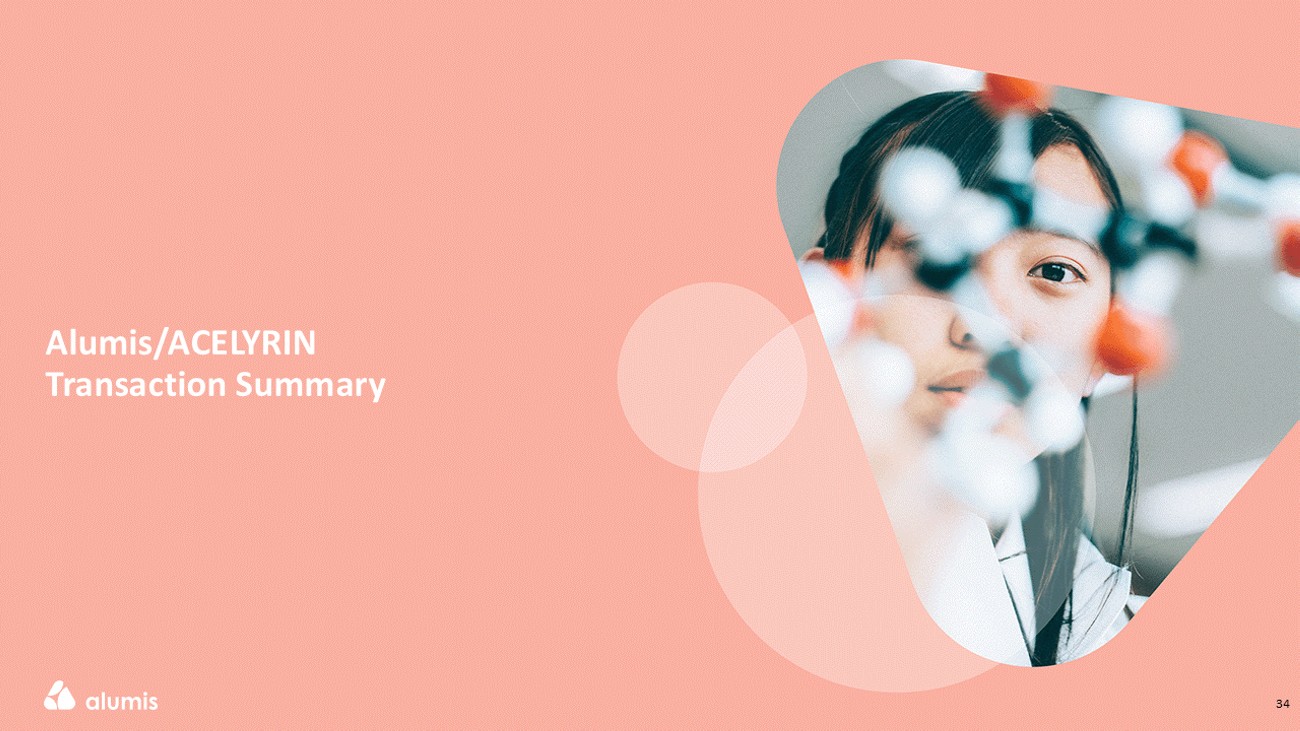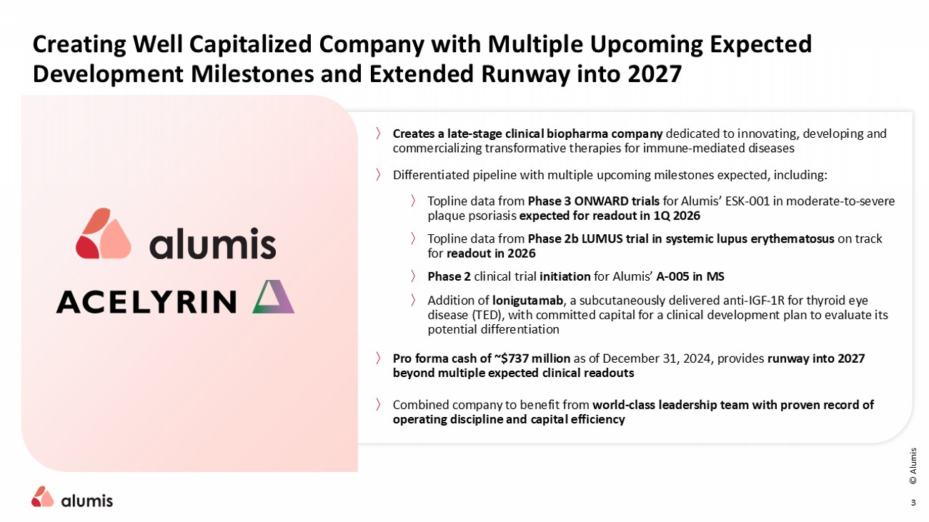2 © Alumis Forward - Looking Statements This presentation contains forward looking statements within the meaning of federal securities laws, including the “safe harb or” provisions of the Private Securities Litigation Reform Act of 1995. Such statements are based upon current plans, estimates a nd expectations of management of Alumis Inc. (“Alumis”) and ACELYRIN, Inc. (“ACELYRIN”) in light of historical results and trends, current conditions and potential future developmen ts, and are subject to various risks and uncertainties that could cause actual results to differ materially from such statements. T he inclusion of forward - looking statements should not be regarded as a representation that such plans, estimates and expectations will be achieved. Words such as “anticipate,” “expec t,” “project,” “intend,” “believe,” “may,” “will,” “should,” “plan,” “could,” “continue,” “target,” “contemplate,” “estimate,” “f or ecast,” “guidance,” “predict,” “possible,” “potential,” “pursue,” “likely,” and words and terms of similar substance used in connection with any discussion of future plans, actions or events identify forward - looking statements. All statements, other than statements of historical facts, including express or impl ied statements regarding the proposed transaction; the conversion of equity interests contemplated by the agreement and plan of merger, dated as of February 6, 2025, as amended on Apr il 20, 2025, by and among the parties (the “merger agreement”); the issuance of common stock of Alumis contemplated by the me rge r agreement; the expected timing of the closing of the proposed transaction; the ability of the parties to complete the proposed transaction considering the various clo sing conditions; the expected benefits of the proposed transaction; the sufficiency of the combined company’s capital resourc es; the combined company’s cash runway, which is preliminary, unaudited and subject to change; the competitive ability and position of the combined company; the clinical pipe lin e of the combined company; and any assumptions underlying any of the foregoing, are forward - looking statements. Risks and uncertainties include, among other things, (i) the risk that the proposed transaction may not be completed in a tim ely basis or at all, which may adversely affect Alumis’ and ACELYRIN’s businesses and the price of their respective securities; ( ii ) the potential failure to receive, on a timely basis or otherwise, the required approvals of the proposed transaction, including stockholder approvals by both Alumis’ stockholders a nd ACELYRIN’S stockholders, and the potential failure to satisfy the other conditions to the consummation of the transaction; (i ii) the effect of the announcement, pendency or completion of the proposed transaction on each of Alumis’ or ACELYRIN’s ability to attract, motivate, retain and hire key per son nel and maintain relationships with partners, suppliers and others with whom Alumis or ACELYRIN does business, or on Alumis’ or ACELYRIN’s operating results and business generally; (iv) that the proposed transaction may divert management’s attention from each of Alumis’ and ACELYRIN’s ongoing business ope rat ions; (v) the risk of any legal proceedings related to the proposed transaction or otherwise, or the impact of the proposed t ran saction thereupon, including resulting expense or delay; (vi) that Alumis or ACELYRIN may be adversely affected by other economic, business and/or competitive factors; (vii) t he occurrence of any event, change or other circumstance that could give rise to the termination of the merger agreement, includ ing in circumstances which would require Alumis or ACELYRIN to pay a termination fee; (viii) the risk that restrictions during the pendency of the proposed transaction may impa ct Alumis’ or ACELYRIN’s ability to pursue certain business opportunities or strategic transactions; (ix) the risk that the anti cip ated benefits and synergies of the proposed transaction may not be fully realized or may take longer to realize than expected; (x) the impact of legislative, regulatory, economic, compe tit ive and technological changes; (xi) risks relating to the value of Alumis securities to be issued in the proposed transaction ; ( xii) the risk that integration of the proposed transaction post closing may not occur as anticipated or the combined company may not be able to achieve the growth prospects expected from th e t ransaction; (xiii) the effect of the announcement, pendency or completion of the proposed transaction on the market price of the common stock of each of Alumis and ACELYRIN; (xiv) the implementation of each of Alumis’ and ACELYRIN’s business model and strategic plans for product candidates and pipe lin e, and challenges inherent in developing, commercializing, manufacturing, launching, marketing and selling potential existing an d new products and product candidates; (xv) the scope, progress, results and costs of developing Alumis’ and ACELYRIN’s product candidates and any future product candidates, in cluding conducting preclinical studies and clinical trials, and otherwise related to the research and development of Alumis’ and ACELYRIN’s pipeline; (xvi) the timing and costs involved in obtaining and maintaining regulatory approval for Alumis’ and ACELYRIN’s current or future product candidates, and any rel ate d restrictions, limitations and/or warnings in the label of any approved product; (xvii) the market for, adoption (including rat e and degree of market acceptance) and pricing and reimbursement of Alumis’ and ACELYRIN’s product candidates, if approved, and their respective abilities to compete with thera pie s and procedures that are rapidly growing and evolving; (xviii) uncertainties in contractual relationships, including collabo rat ions, partnerships,