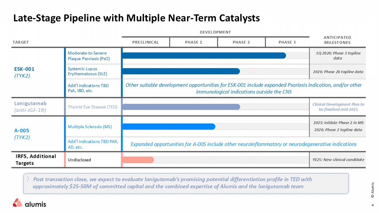© Alumis 3 Creating Well Capitalized Company with Multiple Upcoming Expected Development Milestones and Extended Runway into 2027 〉 Creates a late - stage clinical biopharma company dedicated to innovating, developing and commercializing transformative therapies for immune - mediated diseases 〉 Differentiated pipeline with multiple upcoming milestones expected, including: 〉 Topline data from Phase 3 ONWARD trials for Alumis ’ ESK - 001 in moderate - to - severe plaque psoriasis expected for readout in 1Q 2026 〉 Topline data from Phase 2b LUMUS trial in systemic lupus erythematosus on track for readout in 2026 〉 Phase 2 clinical trial initiation for Alumis ’ A - 005 in MS 〉 Addition of lonigutamab , a subcutaneously delivered anti - IGF - 1R for thyroid eye disease (TED), with committed capital for a clinical development plan to evaluate its potential differentiation 〉 Pro forma cash of ~$737 million as of December 31, 2024, provides runway into 2027 beyond multiple expected clinical readouts 〉 Combined company to benefit from world - class leadership team with proven record of operating discipline and capital efficiency