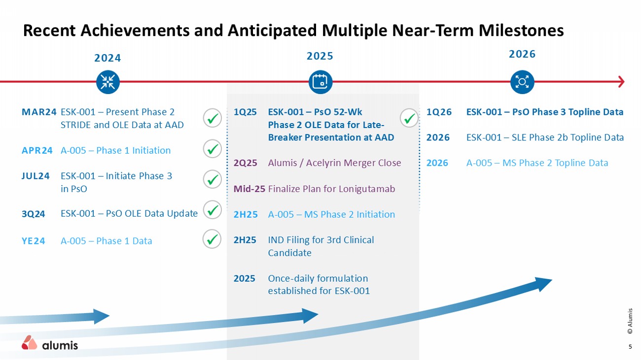 Late - Stage Pipeline with Multiple Near - Term Catalysts 4 © Alumis 〉 Post transaction close, we expect to evaluate lonigutamab’s promising potential differentiation profile in TED with approximately $25 - 50M of committed capital and the combined expertise of Alumis and the lonigutamab team ANTICIPATED MILESTONES DEVELOPMENT PHASE 3 PHASE 2 PHASE 1 PRECLINICAL TARGET 1Q 2026 : Phase 3 topline data Moderate - to - Severe Plaque Psoriasis ( PsO ) ESK - 001 (TYK2) 2026: Phase 2b topline data Systemic Lupus Erythematosus (SLE) Other suitable development opportunities for ESK - 001 include expanded Psoriasis indication, and/or other immunological indications outside the CNS Add’l indications TBD PsA, IBD, etc. Clinical Development Plan to be finalized mid - 2025 Thyroid Eye Disease (TED) Lonigutamab (anti - IGF - 1R) 2025: Initiate Phase 2 in MS 2026: Phase 2 topline data Multiple Sclerosis (MS) A - 005 (TYK2) Expanded opportunities for A - 005 include other neuroinflammatory or neurodegenerative indications Add’l indications TBD PAR, AD, etc . YE25: New clinical candidate Undisclosed IRF5, Additional Targets