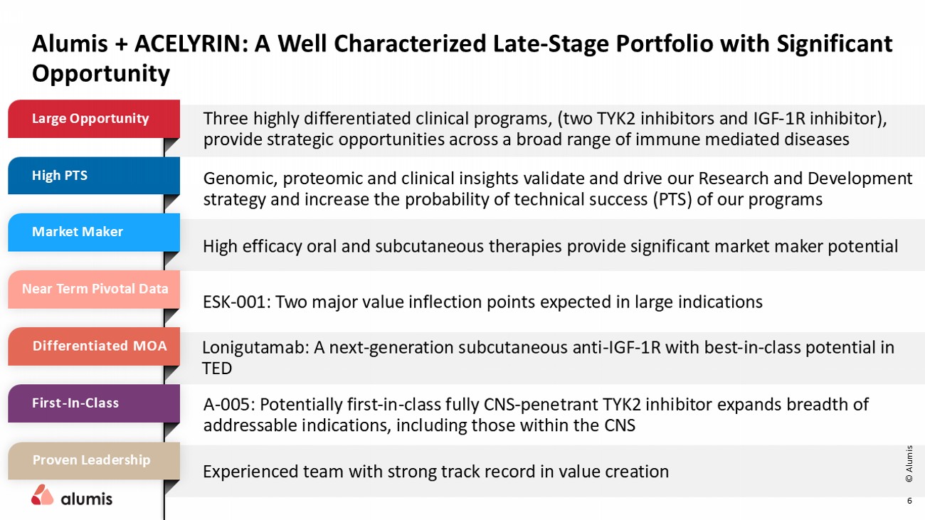 x x © Alumis 5 Recent Achievements and Anticipated Multiple Near - Term Milestones 2024 2025 2026 MAR24 APR24 JUL24 3Q24 YE24 ESK - 001 – Present Phase 2 STRIDE and OLE Data at AAD A - 005 – Phase 1 Initiation ESK - 001 – Initiate Phase 3 in PsO ESK - 001 – PsO OLE Data Update A - 005 – Phase 1 Data 1Q26 2026 2026 ESK - 001 – PsO Phase 3 Topline Data ESK - 001 – SLE Phase 2b Topline Data A - 005 – MS Phase 2 Topline Data ESK - 001 – PsO 52 - Wk Phase 2 OLE Data for Late - Breaker Presentation at AAD Alumis / Acelyrin Merger Close Finalize Plan for Lonigutamab A - 005 – MS Phase 2 Initiation IND Filing for 3rd Clinical Candidate Once - daily formulation established for ESK - 001 1Q25 2 Q25 Mid - 25 2H25 2H25 2025 x x x x