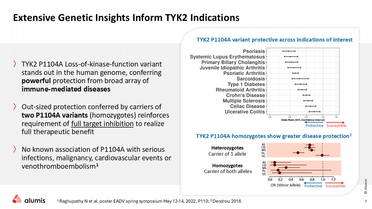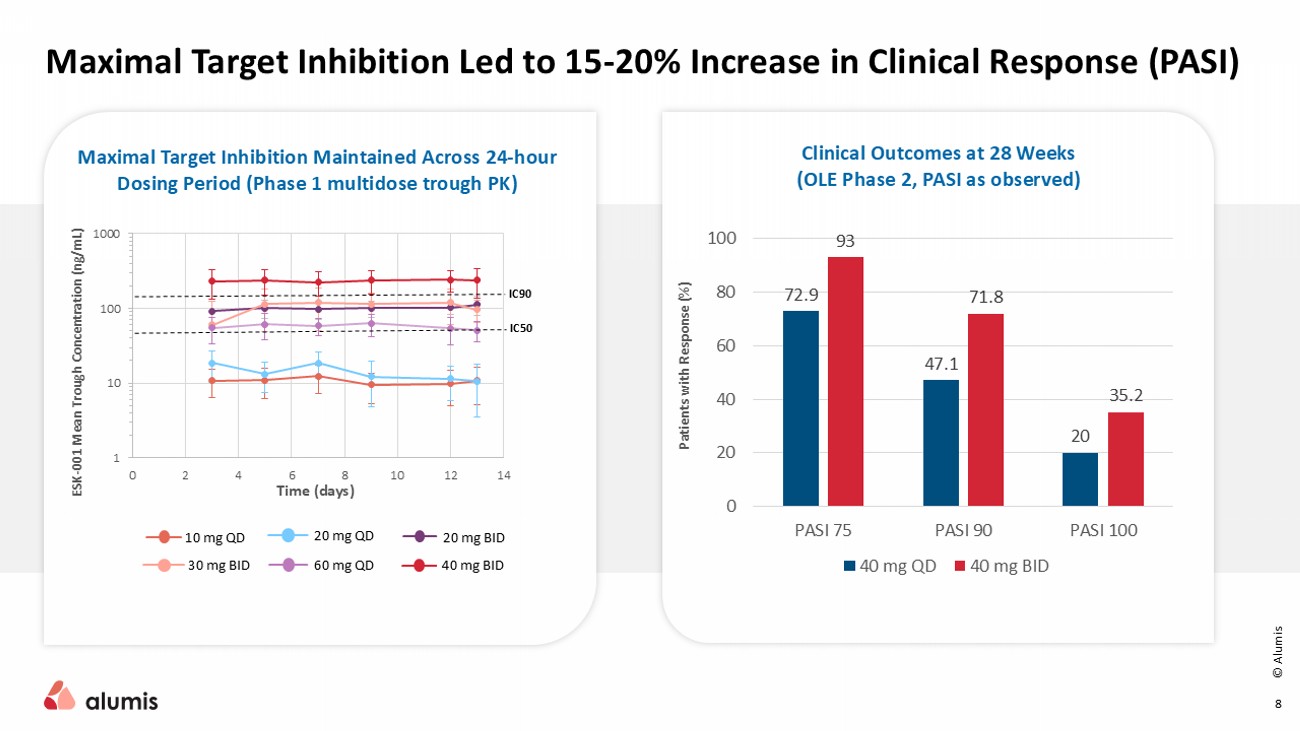 © Alumis 7 Extensive Genetic Insights Inform TYK2 Indications 〉 TYK2 P1104A Loss - of - kinase - function variant stands out in the human genome, conferring powerful protection from broad array of immune - mediated diseases 〉 Out - sized protection conferred by carriers of two P1104A variants (homozygotes) reinforces requirement of full target inhibition to realize full therapeutic benefit 〉 No known association of P1104A with serious infections, malignancy, cardiovascular events or venothromboembolism 1 TYK2 P1104A variant protective across indications of interest 1 Raghupathy N et al. poster EADV spring symposium May 12 - 14, 2022, P110 ; 2 Dendrou 2016 TYK2 P1104A homozygotes show greater disease protection 2 Heterozygotes Carrier of 1 allele Homozygotes Carrier of both alleles Protective Susceptible Protective Susceptible OR (Minor Allele)