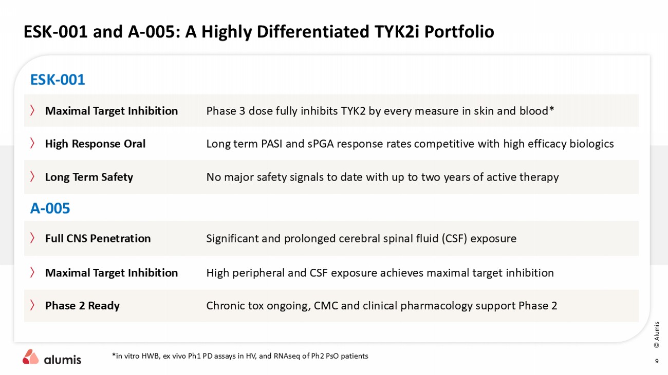 © Alumis 8 Maximal Target Inhibition Led to 15 - 20% Increase in Clinical Response (PASI) Maximal Target Inhibition Maintained Across 24 - hour Dosing Period ( Phase 1 multidose trough PK) Clinical Outcomes at 28 Weeks (OLE Phase 2, PASI as observed) 1 10 100 1000 0 2 4 6 8 10 12 14 ESK - 001 Mean Trough Concentration (ng/mL) Time (days) IC90 IC50 10 mg QD 20 mg QD 20 mg BID 30 mg BID 40 mg BID 60 mg QD Patients with Response (%) 72.9 47.1 20 93 71.8 35.2 0 20 40 60 80 100 PASI 75 PASI 90 PASI 100 40 mg QD 40 mg BID
