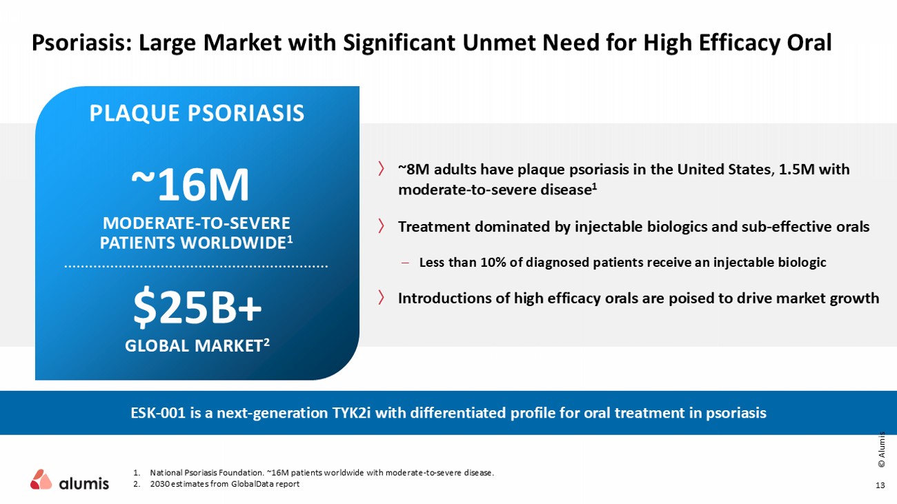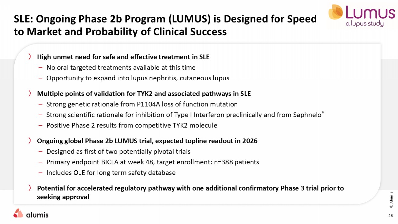 This presentation contains trademarks, service marks, trade names and copyrights of Alumis and other companies which are the property of their respective owners. This presentation discusses product candidates that are under clinical study and which have not yet been approved for marketing by the U.S. Food and Drug Administration. No representation is made as to the safety or effectiveness of these product candidates for the uses for which they are being studied. This presentation also contains estimates and other statistical data made by independent parties and by us relating to market size and growth and other data about our industry. These data involve a number of assumptions and limitations, and you are cautioned not to give undue weight to such estimates. We have not independently verified the data generated by independent parties and cannot guarantee their accuracy or completeness. In addition, projections, assumptions, and estimates of our future performance and the future performance of the markets in which we operate are necessarily subject to a high degree of uncertainty and risk.