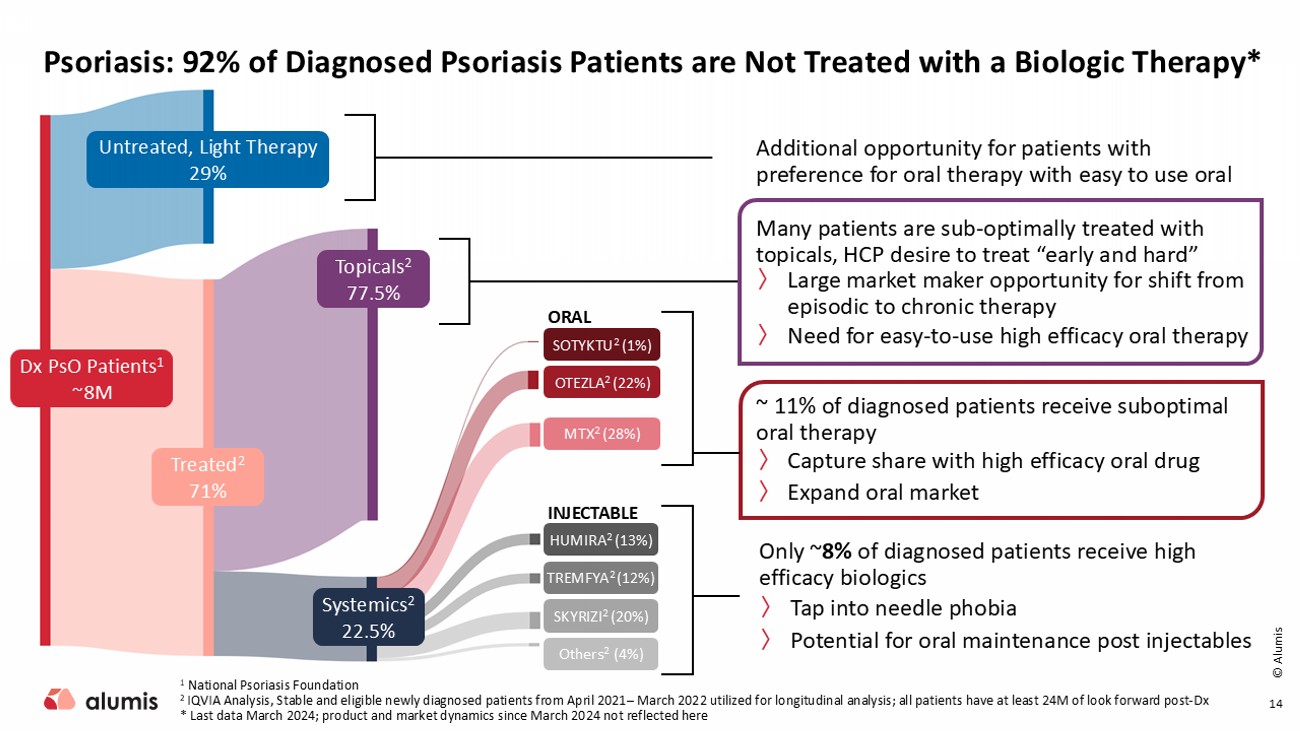ESK - 001 is a next - generation TYK2i with differentiated profile for oral treatment in psoriasis Psoriasis: Large Market with Significant Unmet Need for High Efficacy Oral 1. National Psoriasis Foundation. ~16M patients worldwide with moderate - to - severe disease. 2. 2030 estimates from GlobalData report 13 〉 ~8M adults have plaque psoriasis in the United States , 1.5M with moderate - to - severe disease 1 〉 Treatment dominated by injectable biologics and sub - effective orals – Less than 10% of diagnosed patients receive an injectable biologic 〉 Introductions of high efficacy orals are poised to drive market growth PLAQUE PSORIASIS ~16M MODERATE - TO - SEVERE PATIENTS WORLDWIDE 1 $25B+ GLOBAL MARKET 2 © Alumis