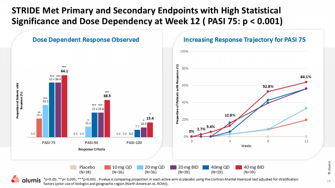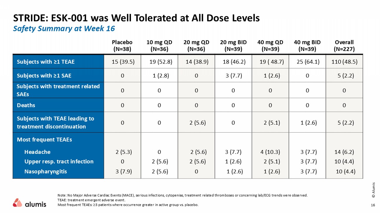 *p<0.05; **p< 0.005; ***p<0.001 . P - value is comparing proportion in each active arm vs placebo using the Cochran - Mantel - Haensze l test adjusted for stratification factors (prior use of biologics and geographic region (North American vs. ROW)). © Alumis 15 STRIDE Met Primary and Secondary Endpoints with High Statistical Significance and Dose Dependency at Week 12 ( PASI 75: p < 0.001) Dose Dependent Response Observed Increasing Response Trajectory for PASI 75 0% 2.7% 5.4% 12.8% 52.8% 64.1% 0% 20% 40% 60% 80% 100% 0 4 8 12 0.0 0.0 0.0 19.4 0.0 0.0 33.3 11.1 0.0 56.4 25.6 7.7 56.4 25.6 10.3 64.1 38.5 15.4 PASI-75 PASI-90 PASI-100 Proportion of Patients with Response (%) Response Criteria *** *** *** *** ** * *** *** *** * * Weeks Proportion of Patients with Response (%) 40 mg BID (N=39) 20 mg BID (N=39) 40mg QD (N=39) 20 mg QD (N=36) 10 mg QD (N=36) Placebo (N=38)