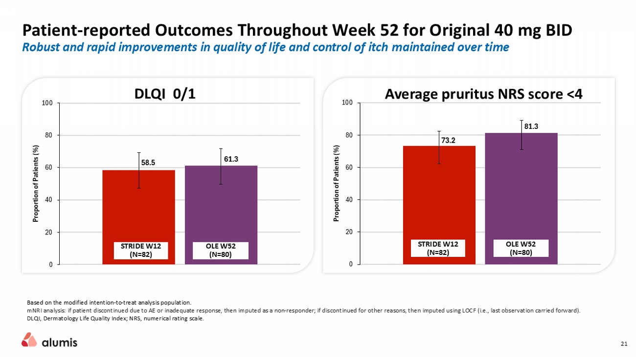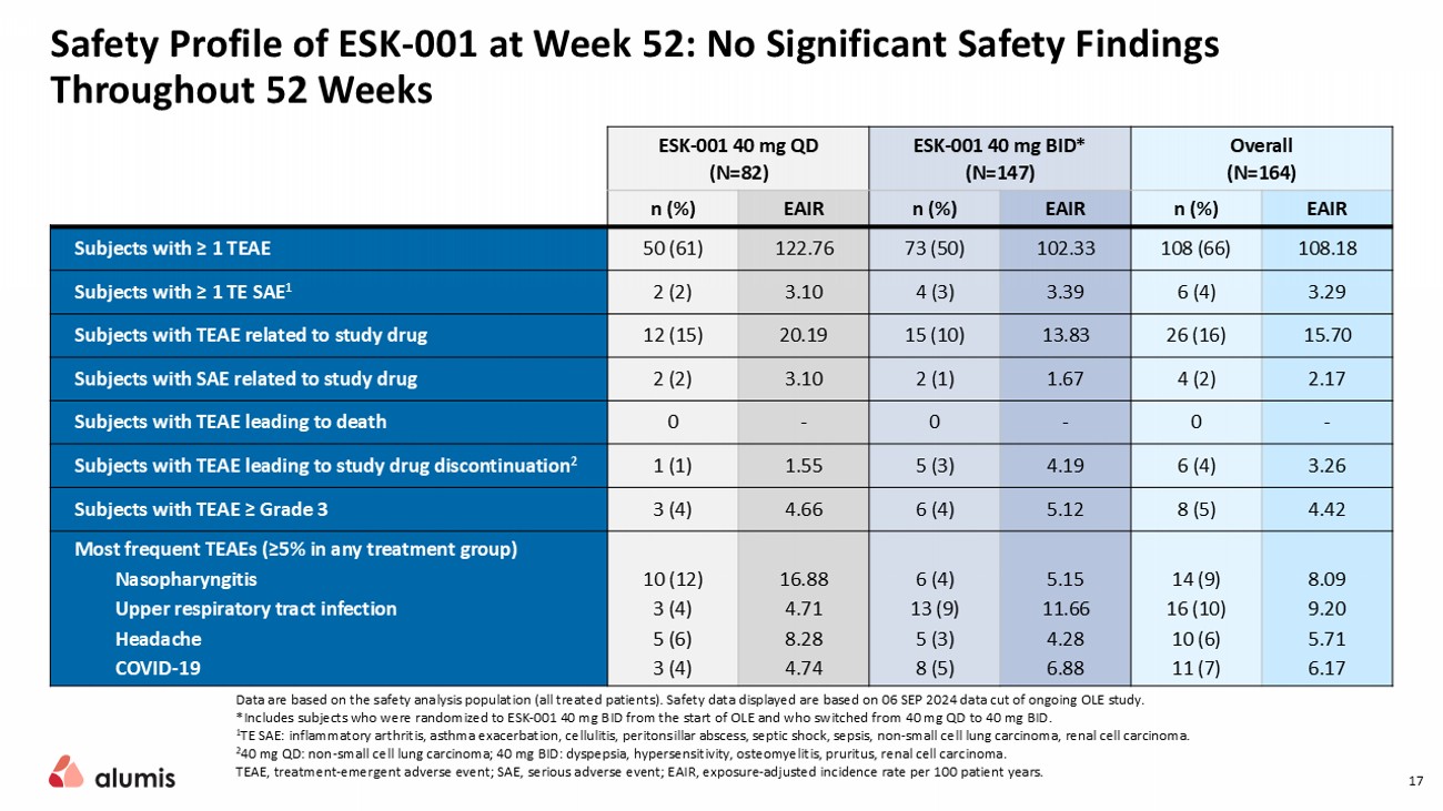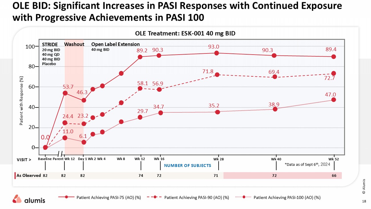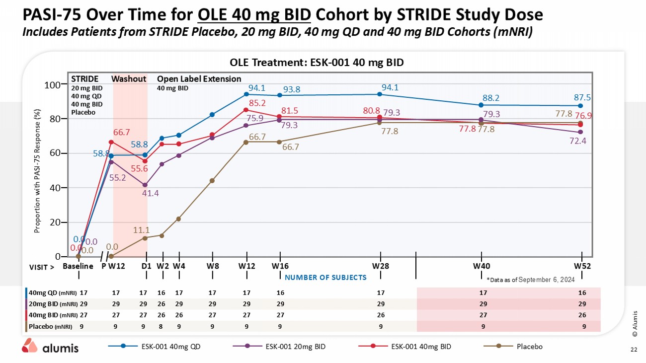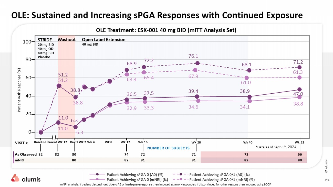 OLE Treatment: ESK - 001 40 mg BID ( mITT Analysis Set) Open Label Extension 40 mg BID Washout STRIDE 20 mg BID 40 mg QD 40 mg BID Placebo Patient with Response (%) 100 80 60 40 20 0 20 OLE: Sustained and Increasing sPGA Responses with Continued Exposure Patient Achieving sPGA 0 (A0) (%) Patient Achieving sPGA 0/1 (A0) (%) Patient Achieving sPGA 0 ( mNRI ) (%) Patient Achieving sPGA 0/1 ( mNRI ) (%) mNRI analysis: if patient discontinued due to AE or inadequate response then imputed as a non - responder; if discontinued for other r easons then imputed using LOCF Baseline Wk 2 Wk 4 Wk 8 Wk 12 Wk 16 Wk 28 VISIT > Wk 40 Wk 52 Day 1 Parent Wk 12 NUMBER OF SUBJECTS 66 72 71 72 74 80 82 82 As Observed 80 82 81 81 82 80 mNRI 51.2 65.4 63.4 67.9 38.8 61.0 61.3 11.0 33.3 32.9 34.6 6.3 34.1 38.8 6.3 39.4 76.1 72.2 37.5 68.9 36.5 11.0 51.2 38.8 38.9 68.1 47.0 71.2 *Data as of Sept 6 th , 2024 © Alumis