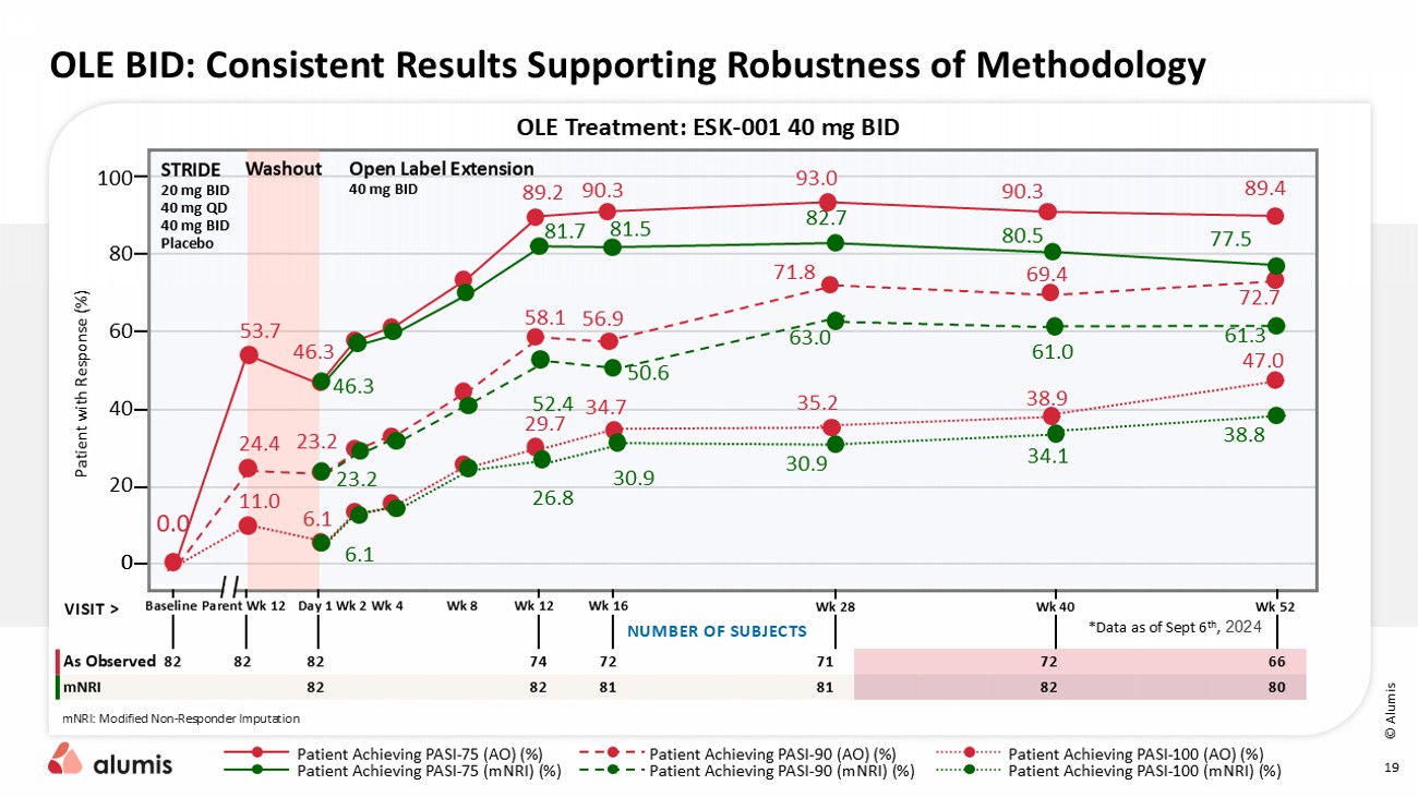 OLE BID: Significant Increases in PASI Responses with Continued Exposure with Progressive Achievements in PASI 100 Patient Achieving PASI - 75 (AO) (%) Patient Achieving PASI - 90 (AO) (%) Patient Achieving PASI - 100 (AO) (%) 18 OLE Treatment: ESK - 001 40 mg BID 66 72 71 72 74 82 82 82 As Observed Open Label Extension 40 mg BID Washout STRIDE 20 mg BID 40 mg QD 40 mg BID Placebo Patient with Response (%) 100 80 60 40 20 0 0 Baseline Wk 2 Wk 4 Wk 8 Wk 12 Wk 16 Wk 28 VISIT > *Data as of Sept 6 th , 2024 Wk 40 Wk 52 Day 1 Parent Wk 12 NUMBER OF SUBJECTS 46.3 23.2 53.7 24.4 11.0 0.0 6.1 35.2 71.8 93.0 90.3 56.9 34.7 89.2 58.1 29.7 38.9 69.4 90.3 47.0 72.7 89.4 © Alumis