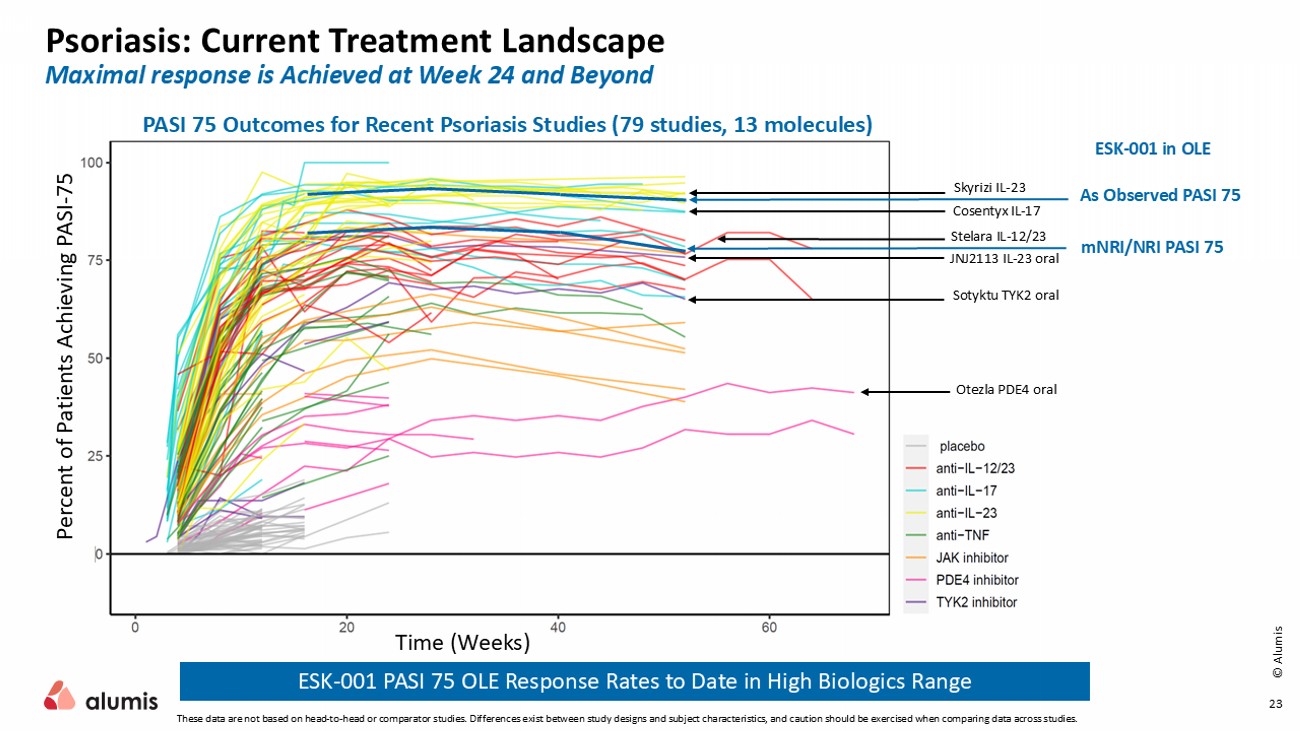 © Alumis 23 Psoriasis: Current Treatment Landscape Maximal response is Achieved at Week 24 and Beyond Percent of Patients Achieving PASI - 75 Time (Weeks) Skyrizi IL - 23 Cosentyx IL - 17 Stelara IL - 12/23 JNJ2113 IL - 23 oral Sotyktu TYK2 oral Otezla PDE4 oral PASI 75 Outcomes for Recent Psoriasis Studies (79 studies, 13 molecules) ESK - 001 in OLE As Observed PASI 75 mNRI /NRI PASI 75 These data are not based on head - to - head or comparator studies. Differences exist between study designs and subject characterist ics, and caution should be exercised when comparing data across studies. ESK - 001 PASI 75 OLE Response Rates to Date in High Biologics Range