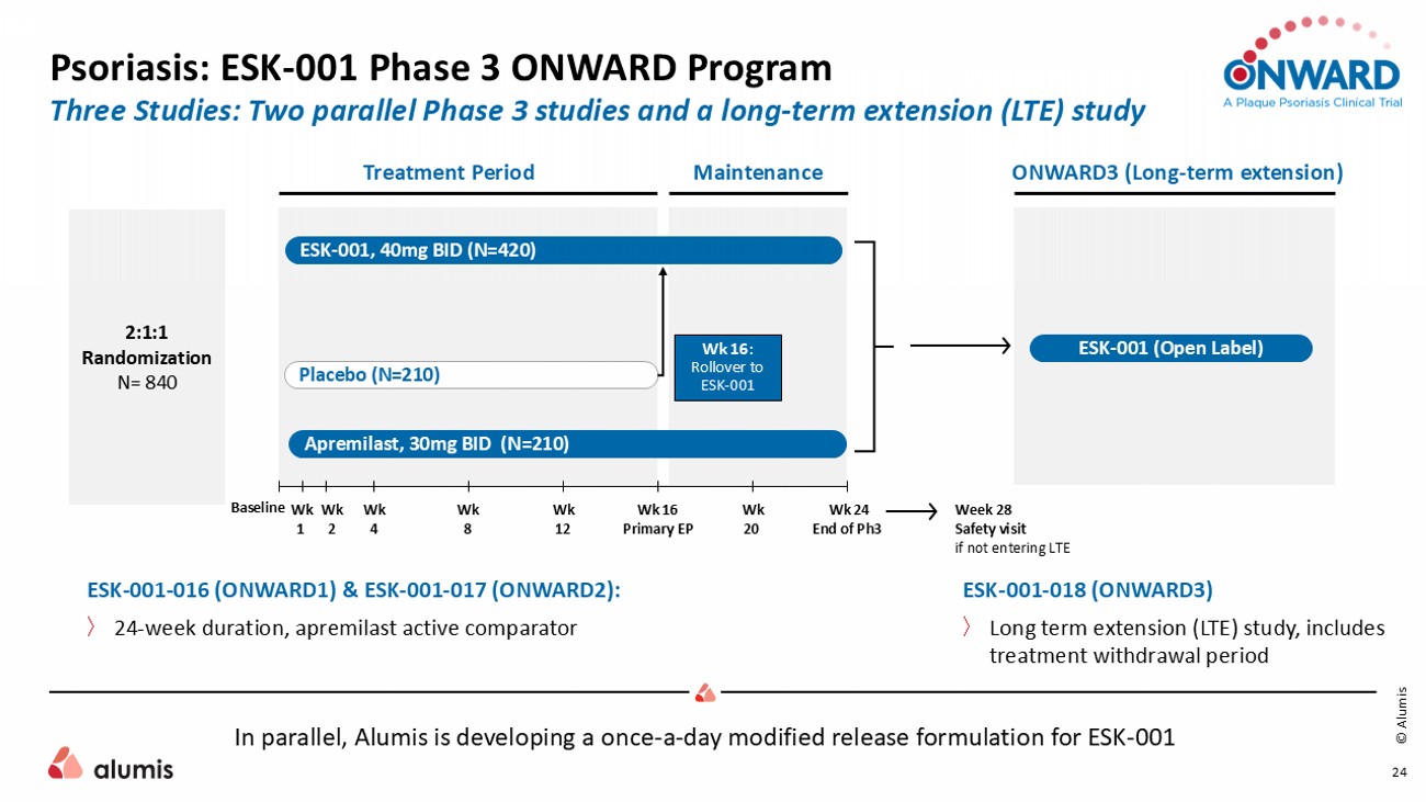 24 Psoriasis: ESK - 001 Phase 3 ONWARD Program Three Studies: Two parallel Phase 3 studies and a long - term extension (LTE) study ESK - 001, 40mg BID (N=420) Treatment Period Maintenance Placebo (N= 210 ) Wk 16 : Rollover to ESK - 001 Apremilast, 30mg BID (N=210) ESK - 001 (Open Label) ONWARD3 (Long - term extension) 2:1:1 Randomization N= 840 Wk 16 Primary EP Wk 24 End of Ph3 Wk 20 Wk 2 Wk 4 Wk 8 Wk 12 Wk 1 Baseline Week 28 Safety visit if not entering LTE ESK - 001 - 016 (ONWARD1) & ESK - 001 - 017 (ONWARD2): 〉 24 - week duration, apremilast active comparator ESK - 001 - 018 (ONWARD3) 〉 Long term extension (LTE) study, includes treatment withdrawal period In parallel, Alumis is developing a once - a - day modified release formulation for ESK - 001 © Alumis