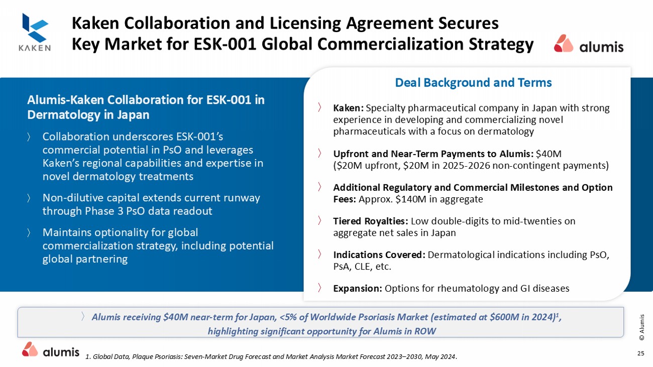 1. Global Data, Plaque Psoriasis: Seven - Market Drug Forecast and Market Analysis Market Forecast 2023 – 2030, May 2024. © Alumis 25 Kaken Collaboration and Licensing Agreement Secures Key Market for ESK - 001 Global Commercialization Strategy Alumis - Kaken Collaboration for ESK - 001 in Dermatology in Japan 〉 Collaboration underscores ESK - 001’s commercial potential in PsO and leverages Kaken’s regional capabilities and expertise in novel dermatology treatments 〉 Non - dilutive capital extends current runway through Phase 3 PsO data readout 〉 Maintains optionality for global commercialization strategy, including potential global partnering 〉 Kaken: Specialty pharmaceutical company in Japan with strong experience in developing and commercializing novel pharmaceuticals with a focus on dermatology 〉 Upfront and Near - Term Payments to Alumis : $40M ($20M upfront, $20M in 2025 - 2026 non - contingent payments) 〉 Additional Regulatory and Commercial Milestones and Option Fees: Approx. $140M in aggregate 〉 Tiered Royalties: Low double - digits to mid - twenties on aggregate net sales in Japan 〉 Indications Covered: Dermatological indications including PsO , PsA, CLE, etc. 〉 Expansion: Options for rheumatology and GI diseases Deal Background and Terms 〉 Alumis receiving $40M near - term for Japan , <5 % of Worldwide Psoriasis Market (estimated at $600M in 2024) 1 , highlighting significant opportunity for Alumis in ROW
