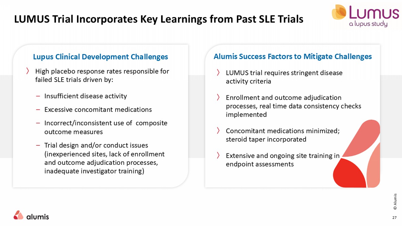 SLE: Ongoing Phase 2b Program (LUMUS) is Designed for Speed to Market and Probability of Clinical Success 26 〉 High unmet need for safe and effective treatment in SLE – No oral targeted treatments available at this time – Opportunity to expand into lupus nephritis, cutaneous lupus 〉 Multiple points of validation for TYK2 and associated pathways in SLE – Strong genetic rationale from P1104A loss of function mutation – Strong scientific rationale for inhibition of Type I Interferon preclinically and from Saphnelo ® – Positive Phase 2 results from competitive TYK2 molecule 〉 Ongoing global Phase 2b LUMUS trial, expected topline readout in 2026 – Designed as first of two potentially pivotal trials – Primary endpoint BICLA at week 48, target enrollment: n=388 patients – Includes OLE for long term safety database 〉 Potential for accelerated regulatory pathway with one additional confirmatory Phase 3 trial prior to seeking approval © Alumis