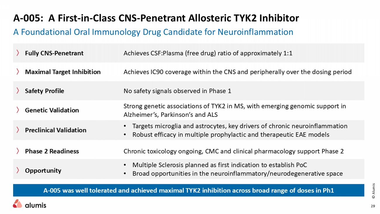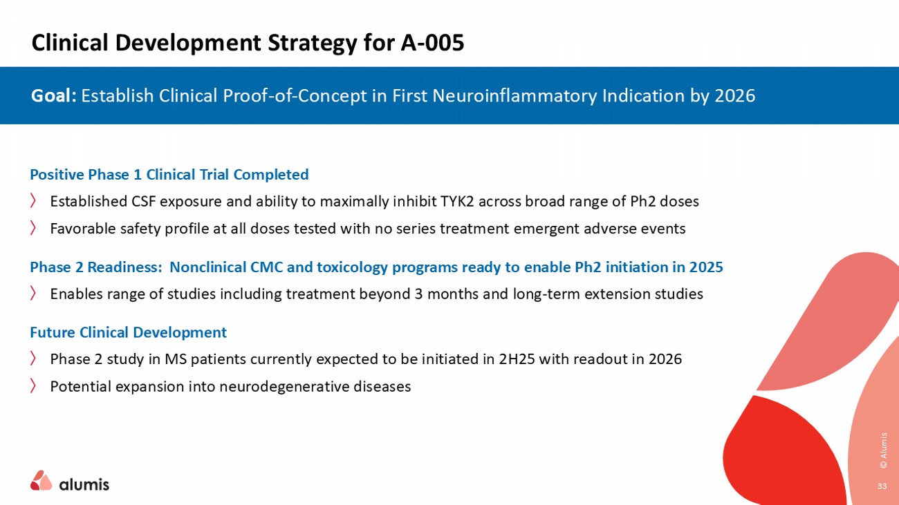 Clinical Development Strategy for A - 005 33 Goal : Establish Clinical Proof - of - Concept in First Neuroinflammatory Indication by 2026 © Alumis Positive Phase 1 Clinical Trial Completed 〉 Established CSF exposure and ability to maximally inhibit TYK2 across broad range of Ph2 doses 〉 Favorable safety profile at all doses tested with no series treatment emergent adverse events Phase 2 Readiness: Nonclinical CMC and toxicology programs ready to enable Ph2 initiation in 2025 〉 Enables range of studies including treatment beyond 3 months and long - term extension studies Future Clinical Development 〉 Phase 2 study in MS patients currently expected to be initiated in 2H25 with readout in 2026 〉 Potential expansion into neurodegenerative diseases