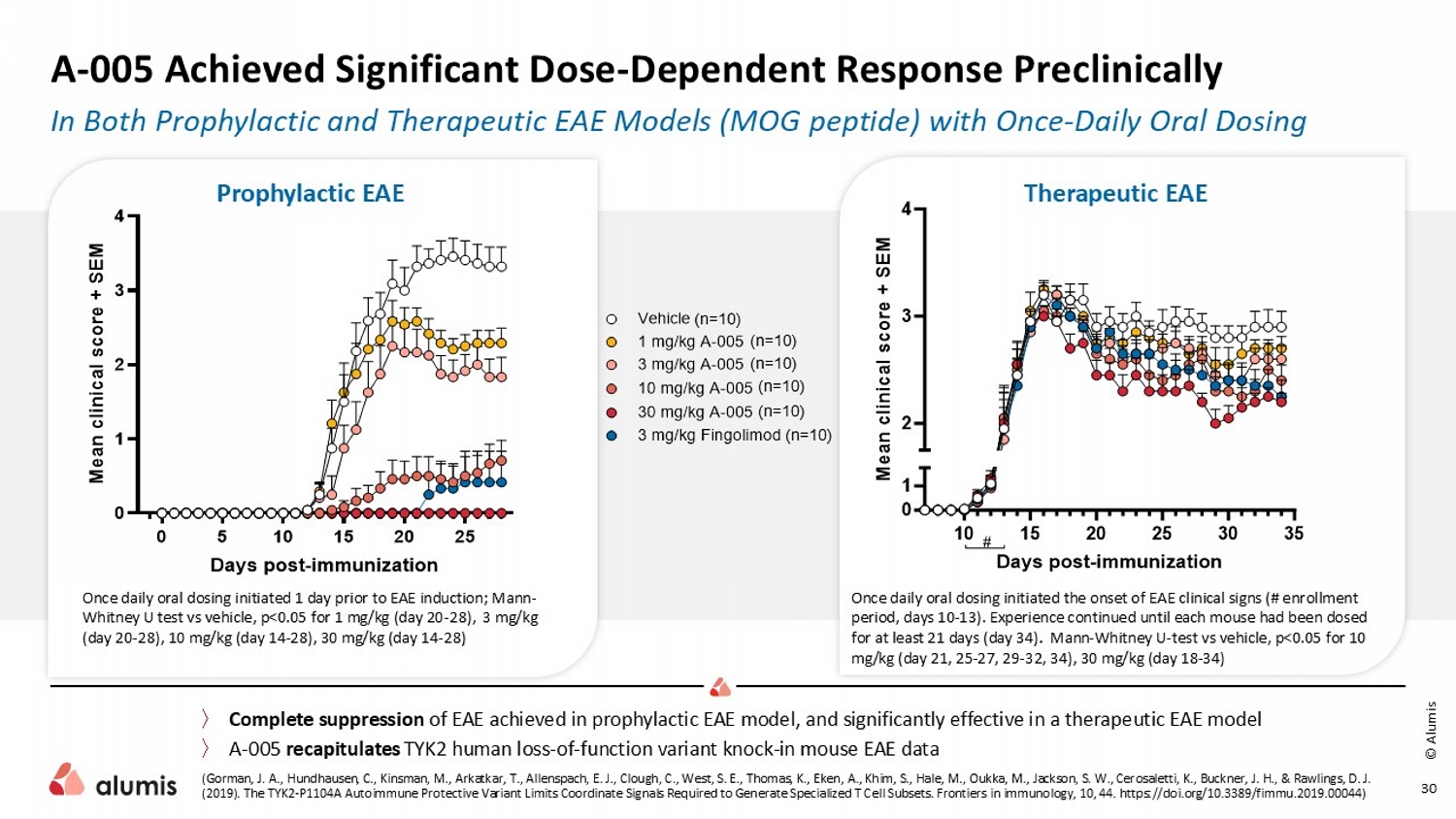 Once daily oral dosing initiated 1 day prior to EAE induction; Mann - Whitney U test vs vehicle, p<0.05 for 1 mg/kg (day 20 - 28), 3 mg/kg (day 20 - 28), 10 mg/kg (day 14 - 28), 30 mg/kg (day 14 - 28) (Gorman, J. A., Hundhausen , C., Kinsman, M., Arkatkar , T., Allenspach , E. J., Clough, C., West, S. E., Thomas, K., Eken , A., Khim , S., Hale, M., Oukka , M., Jackson, S. W., Cerosaletti , K., Buckner, J. H., & Rawlings, D. J. (2019). The TYK2 - P1104A Autoimmune Protective Variant Limits Coordinate Signals Required to Generate Specialized T Cell Subsets. Frontiers in immunology, 10, 44. https:// doi.org /10.3389/fimmu.2019.00044) Once daily oral dosing initiated the onset of EAE clinical signs (# enrollment period, days 10 - 13). Experience continued until each mouse had been dosed for at least 21 days (day 34). Mann - Whitney U - test vs vehicle, p<0.05 for 10 mg/kg (day 21 , 25 - 27, 29 - 32, 34), 30 mg/kg (day 18 - 34) 30 A - 005 Achieved Significant Dose - Dependent Response Preclinically In Both Prophylactic and Therapeutic EAE Models (MOG peptide) with Once - Daily Oral Dosing Therapeutic EAE Prophylactic EAE (n=10) (n=10) (n=10) (n=10) (n=10) (n=10) © Alumis 〉 Complete suppression of EAE achieved in prophylactic EAE model, and significantly effective in a therapeutic EAE model 〉 A - 005 recapitulates TYK2 human loss - of - function variant knock - in mouse EAE data