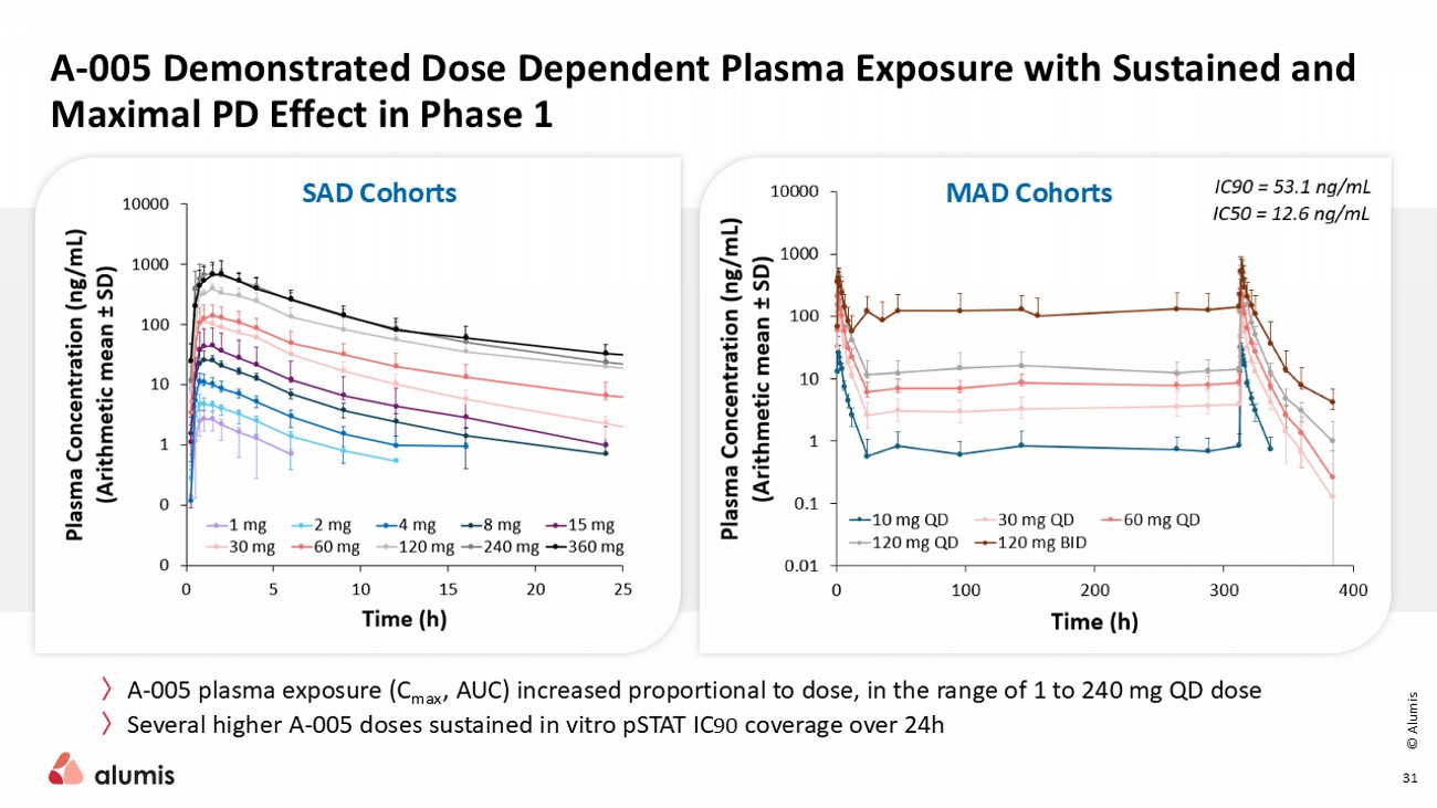 © Alumis 31 A - 005 Demonstrated Dose Dependent Plasma Exposure with Sustained and Maximal PD Effect in Phase 1 〉 A - 005 plasma exposure ( C max , AUC) increased proportional to dose, in the range of 1 to 240 mg QD dose 〉 Several higher A - 005 doses sustained in vitro pSTAT IC 90 coverage over 24h SAD Cohorts MAD Cohorts