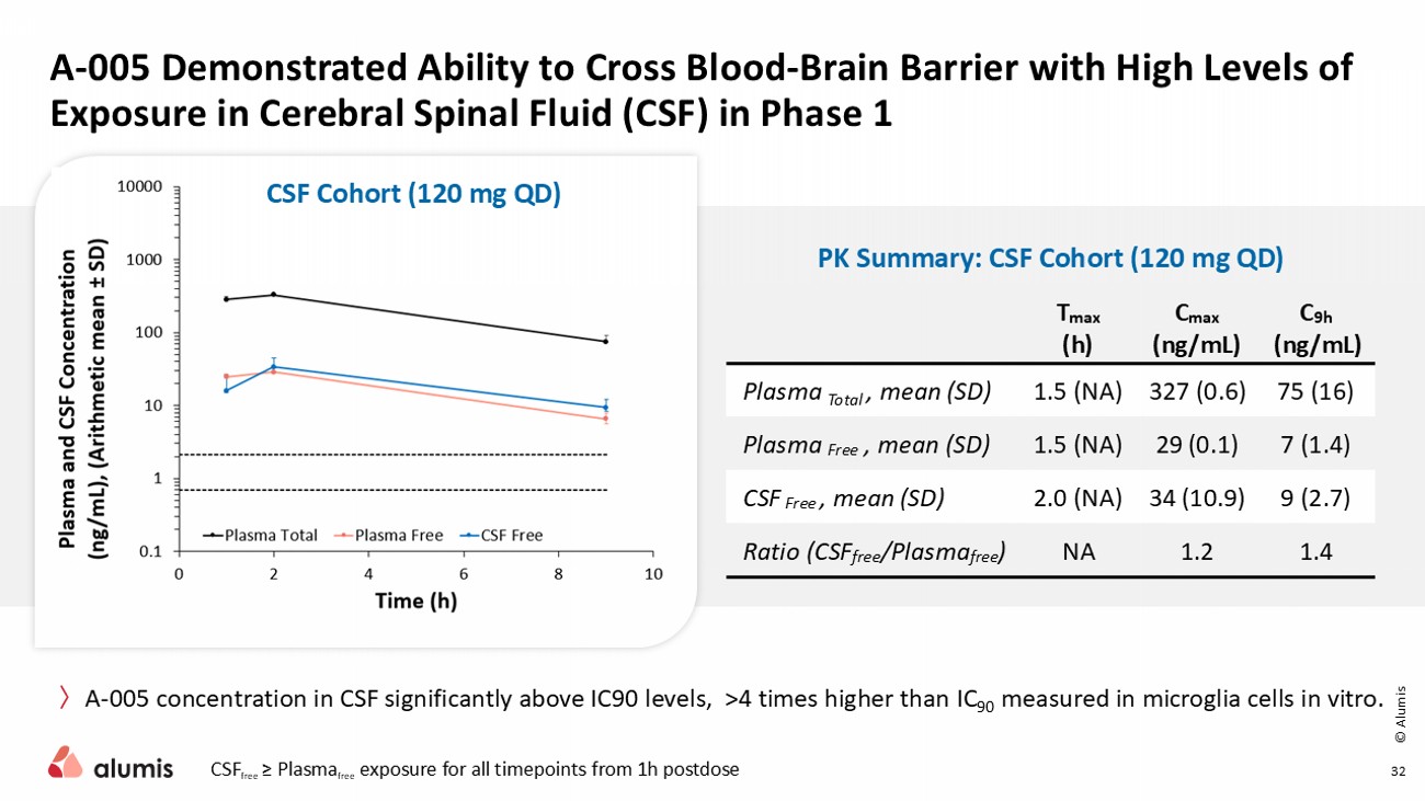 CSF free ≥ Plasma free exposure for all timepoints from 1h postdose © Alumis 32 A - 005 Demonstrated Ability to Cross Blood - Brain Barrier with High Levels of Exposure in Cerebral Spinal Fluid (CSF) in Phase 1 PK Summary: CSF Cohort (120 mg QD) C 9h (ng/mL) C max (ng/mL) T max (h) 75 (16) 327 (0.6) 1.5 (NA) Plasma Total , m ean (SD) 7 (1.4) 29 (0.1) 1.5 (NA) Plasma Free , m ean (SD) 9 (2.7) 34 (10.9) 2.0 (NA) CSF Free , m ean (SD) 1.4 1.2 NA Ratio ( CSF free / Plasma free ) 〉 A - 005 concentration in CSF s ignificantly above IC90 levels, >4 times higher than IC 90 measured in microglia cells in vitro. CSF Cohort (120 mg QD)