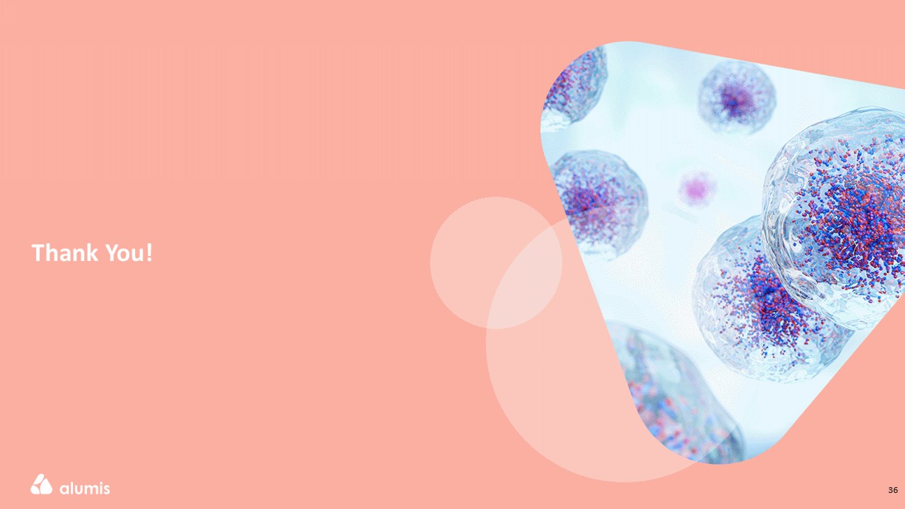 1. On a fully diluted basis © Alumis 35 ACELYRIN Transaction Highlights 〉 All stock merger 〉 ACELYRIN stockholders to receive 0.4814 shares of Alumis common stock for each share of ACELYRIN common stock owned Consideration 〉 Alumis stockholders to own approximately 52% of the combined company 〉 ACELYRIN stockholders to own approximately 48% of the combined company Pro Forma Ownership 1 〉 ~$737M pro forma cash at the end of Q4 2024 〉 Expect pro forma financial plans to extend runway into 2027 Cash Position 〉 Combined company to operate under the Alumis name 〉 The combined company will be led by current Alumis executive team 〉 Alumis Board will expand to nine directors, including two additional directors from ACELYRIN’s Board Leadership 〉 Expected in the second quarter of 2025 〉 Subject to approval of Alumis and ACELYRIN stockholders and satisfaction of other customary closing conditions Transaction Closing and Conditions