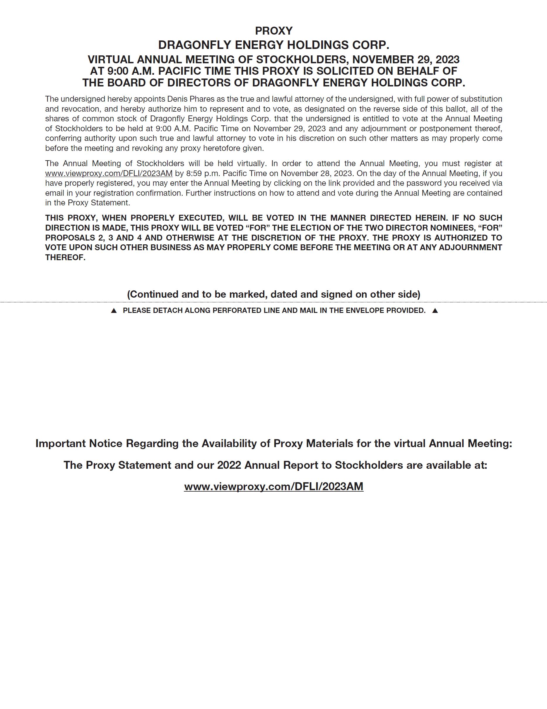 You are cordially invited to attend the 2023 Annual Meeting of Stockholders of Dragonfly Energy Holdings Corp., or the Annual Meeting, which will be held on Wednesday, November 29, 2023, at 9:00 a.m., Pacific time. This year’s Annual Meeting will be held via the Internet. Stockholders will be able to listen to the meeting live, submit questions and vote online regardless of location via the Internet at http://www.viewproxy.com/DFLI/2023AM. You will be able to attend the Annual Meeting by first registering at http://www.viewproxy.com/DFLI/2023AM. You will receive a meeting invitation by e-mail with your unique join link along with a password prior to the meeting date. You will not be able to attend the Annual Meeting in person.