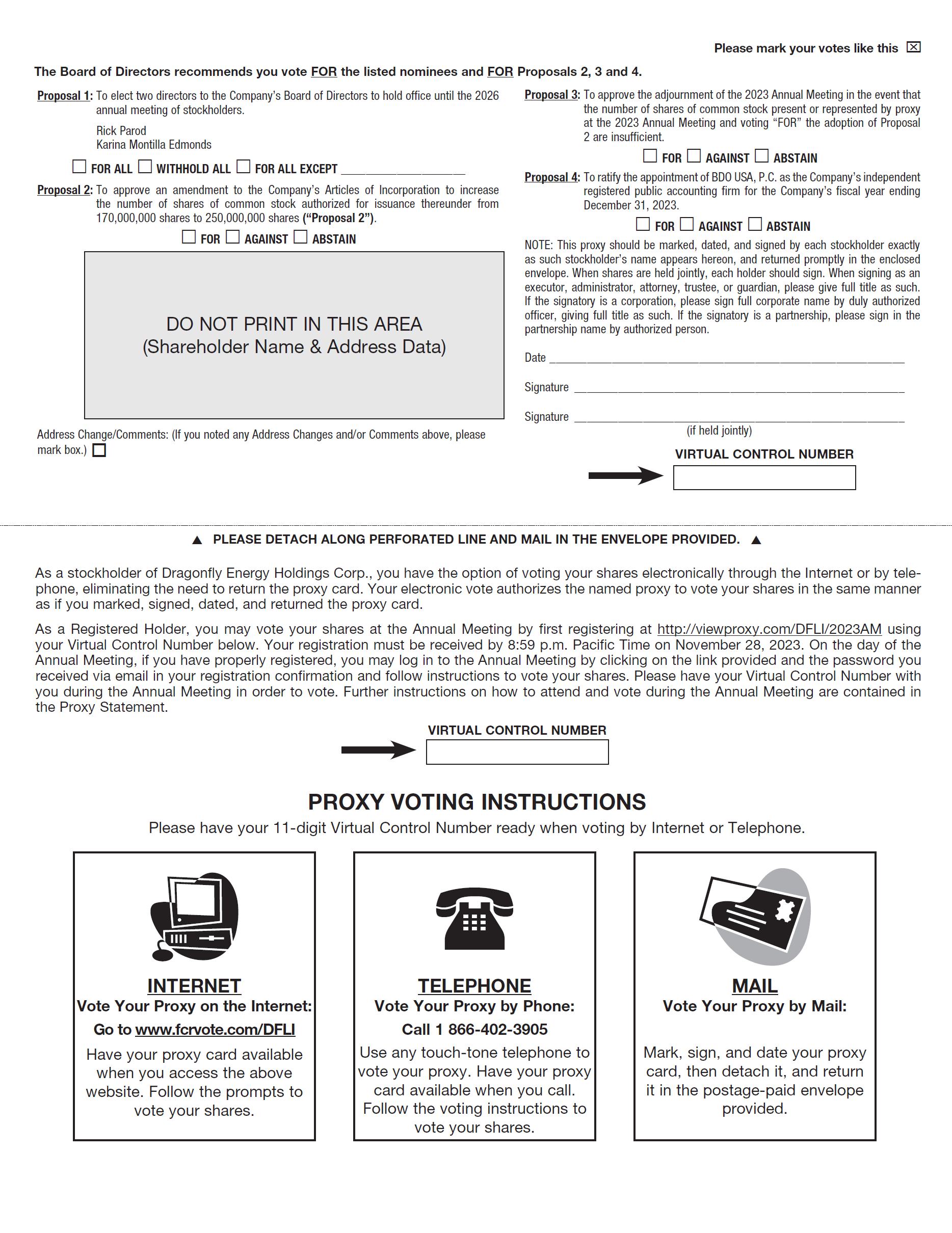 You are cordially invited to attend the Annual Meeting via live webcast by visiting http://www.viewproxy.com/DFLI/2023AM. To be sure your vote is counted and assure a quorum is present, it is important that you vote your shares regardless of the number of shares you own. The Board of Directors urges you to vote over the Internet by going to http://www.viewproxy.com/DFLI/2023AM or by telephone by calling Alliance Advisors at (866) 612-8937 or to sign, date and mark the proxy card promptly and return it to Dragonfly Energy Holdings Corp. Voting over the Internet or by telephone or by returning the proxy card will not prevent you from voting at the virtual Annual Meeting. Under Securities and Exchange Commission rules, we are providing access to our proxy materials both by sending you this full set of proxy materials, and by notifying you of the availability of our proxy materials on the Internet.