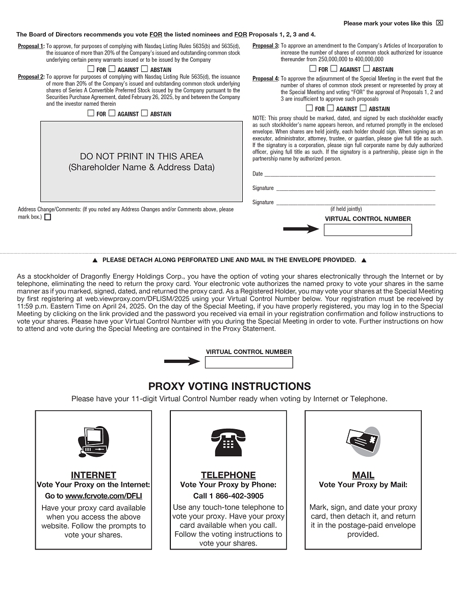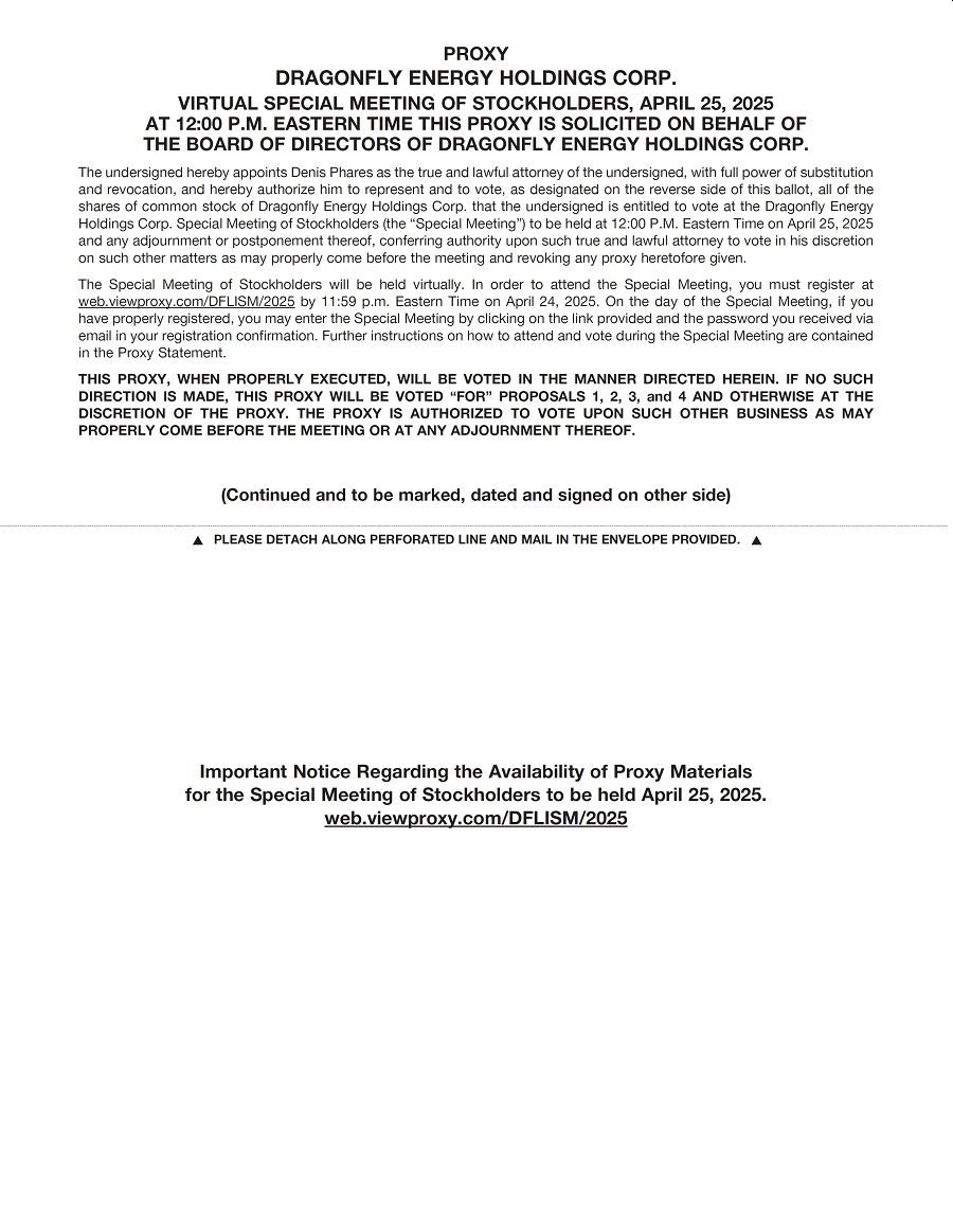 You are cordially invited to attend the Special Meeting of Stockholders (the “Special Meeting”) of Dragonfly Energy Holdings Corp. (the “Company”), which will be held on Friday, April 25, 2025, at 12:00 p.m., Eastern Time. The Special Meeting will be held via the Internet. Stockholders will be able to listen to the meeting live, submit questions and vote online regardless of location via the Internet at http://www.web.viewproxy.com/DFLISM/2025. You will be able to attend the Special Meeting by first registering at http://www.web.viewproxy.com/DFLISM/2025. You will receive a meeting invitation by e-mail with your unique join link along with a password prior to the meeting date. You will not be able to attend the Special Meeting in person.