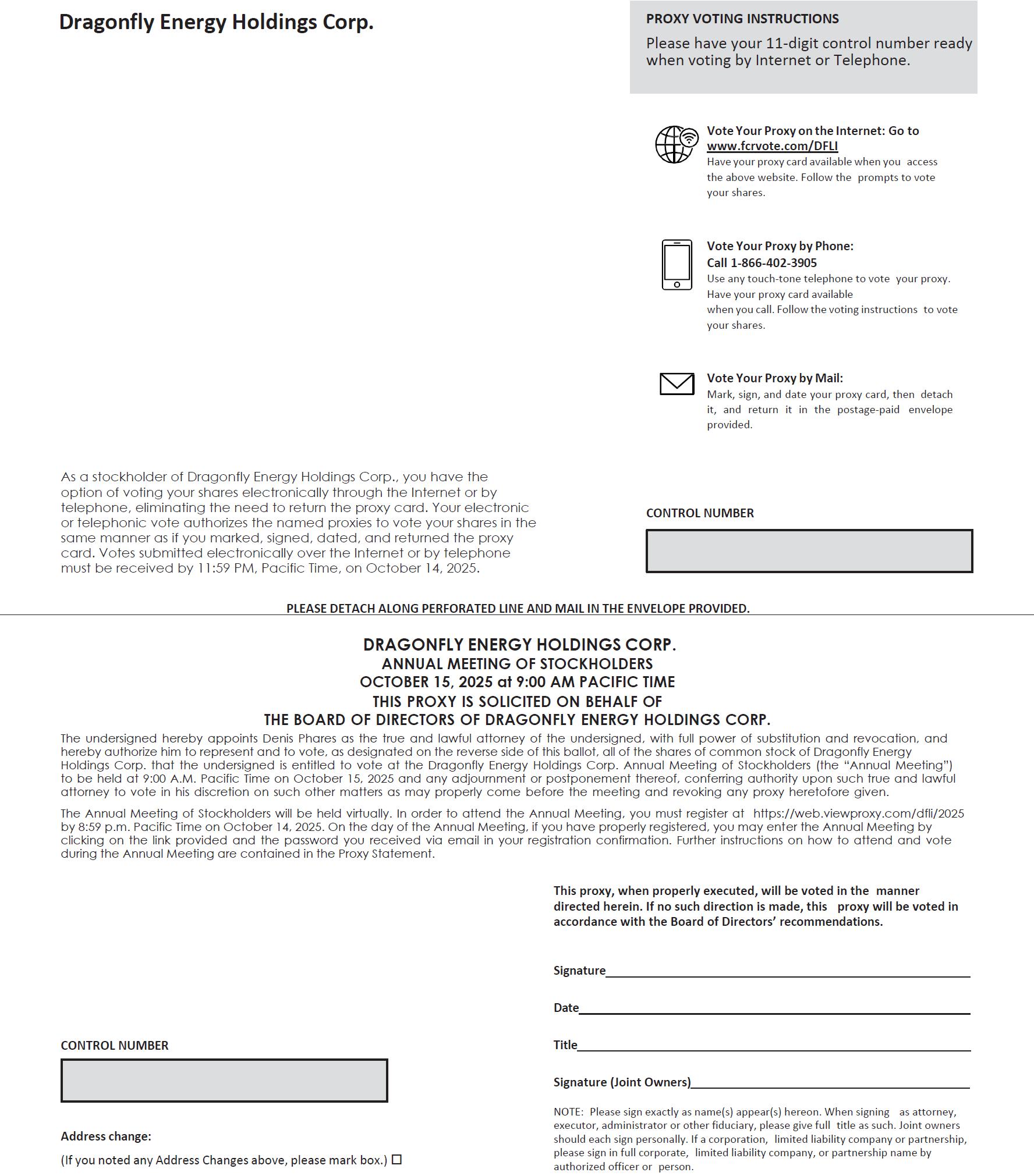 You are cordially invited to attend the 2025 Annual Meeting of Stockholders of Dragonfly Energy Holdings Corp. (the “Company”), or the Annual Meeting, which will be held on Monday, October 15, 2025, at 9:00 a.m., Pacific Time. This year’s Annual Meeting will be held via the Internet. Stockholders will be able to listen to the meeting live, submit questions and vote online regardless of location via the Internet at http://web.viewproxy.com/DFLI/2025. You will be able to attend the Annual Meeting by first registering at http://web.viewproxy.com/DFLI/2025. You will receive a meeting invitation by e-mail with your unique join link along with a password prior to the meeting date. You will not be able to attend the Annual Meeting in person.