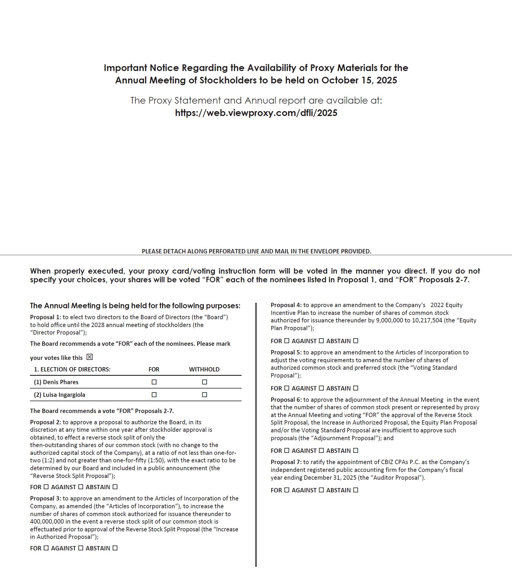 IMPORTANT NOTICE REGARDING THE AVAILABILITY OF PROXY MATERIALS FOR THE 2025 ANNUAL MEETING OF STOCKHOLDERS TO BE HELD ON OCTOBER 15, 2025: Our Proxy Statement for the 2025 Annual Meeting of Stockholders and the Annual Report to Stockholders on Form 10-K for the fiscal year ended December 31, 2024 are available at http://web.viewproxy.com/DFLI/2025.