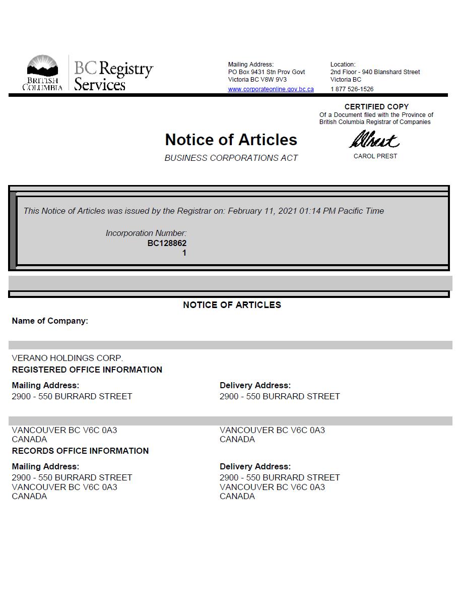 | ● | We are a public reporting company with the U.S. Securities and Exchange Commission (the “SEC”), and our subordinate voting shares are registered with the SEC and quoted in the United States on the OTCQX under the trading symbol “VRNOF”. | |