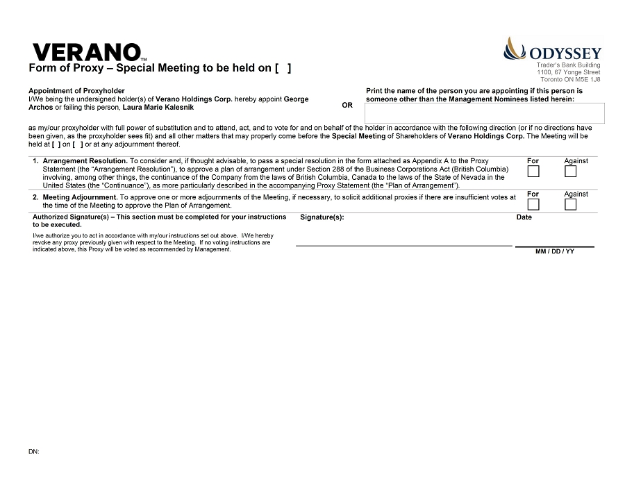 This management information circular and proxy statement (this “Proxy Statement”) contains information about the Special Meeting of Shareholders of Verano Holdings Corp. (the “Meeting”), to be held via live webcast on [●], 2025 beginning at [●] (Central time), at [●]. The Verano Holdings Corp. board of directors (the “Board”) is using this Proxy Statement to solicit proxies for use at the Meeting. Unless the context otherwise requires, references to “we,” “us,” “our,” “Company,” “Verano” or similar terms refer to Verano Holdings Corp., a British Columbia corporation, together with its subsidiaries. The mailing address of our principal executive office is 224 West Hill Street, Suite 400, Chicago, Illinois 60610, U.S.A.