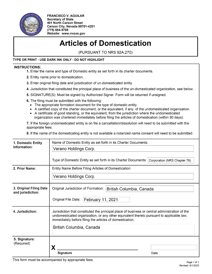The Arrangement, among other things, is to complete the Continuance, which involves the Company continuing out from the jurisdiction of British Columbia, Canada and its concurrent domestication in the State of Nevada in the United States, resulting in the Company becoming a Nevada corporation. We believe the Continuance to Nevada will better reflect and align with our business and operational focus and strategic objectives, and will provide other expected and potential benefits.