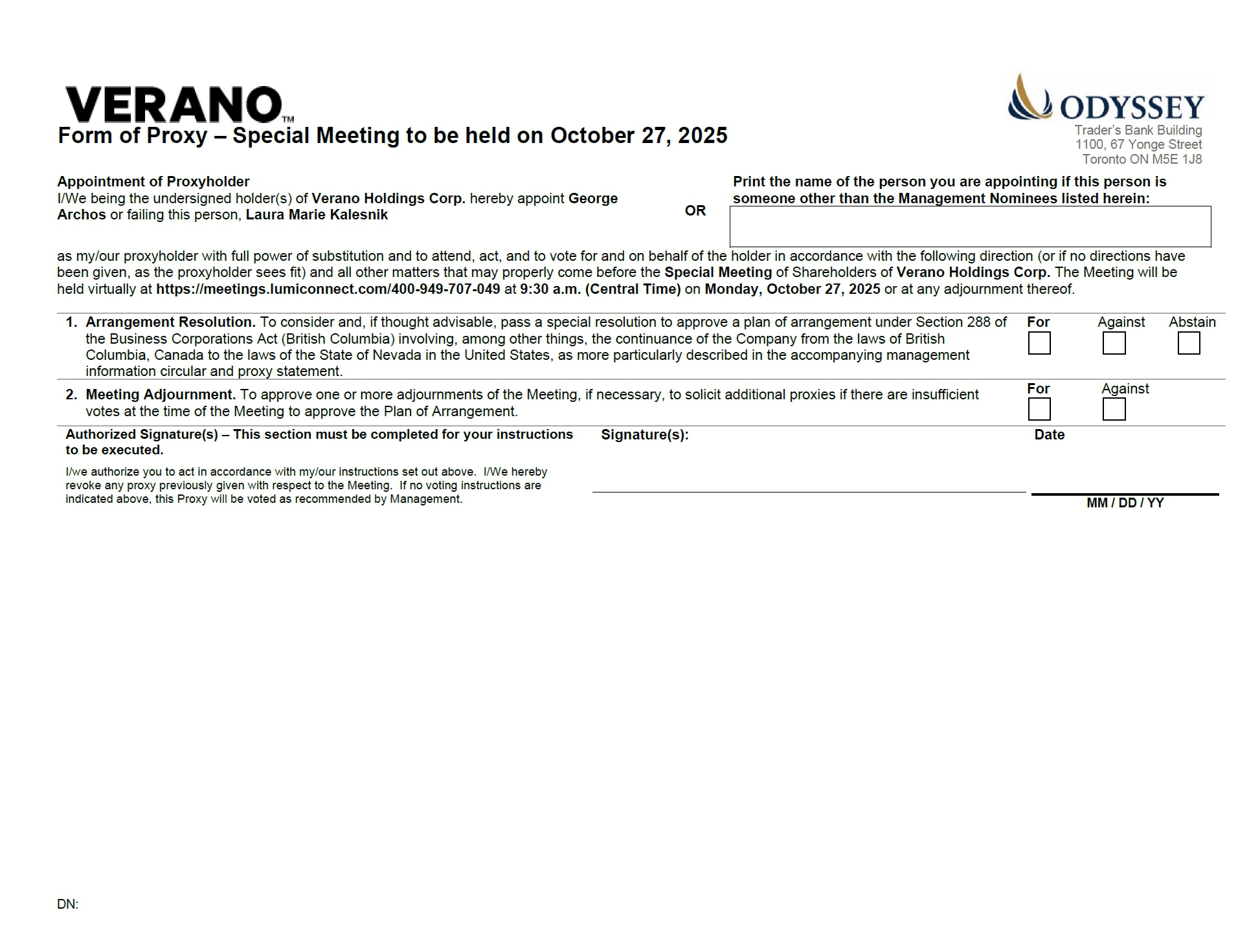 This management information circular and proxy statement (this “Proxy Statement”) contains information about the Special Meeting of Shareholders of Verano Holdings Corp. (the “Meeting”), to be held via live webcast on October 27, 2025 beginning at 9:30 a.m. (Central time), at https://meetings.lumiconnect.com/400-949-707-049. The Verano Holdings Corp. board of directors (the “Board”) is using this Proxy Statement to solicit proxies for use at the Meeting. Unless the context otherwise requires, references to “we,” “us,” “our,” “Company,” “Verano” or similar terms refer to Verano Holdings Corp., a British Columbia corporation, together with its subsidiaries. The mailing address of our principal executive office is 224 West Hill Street, Suite 400, Chicago, Illinois 60610, U.S.A.