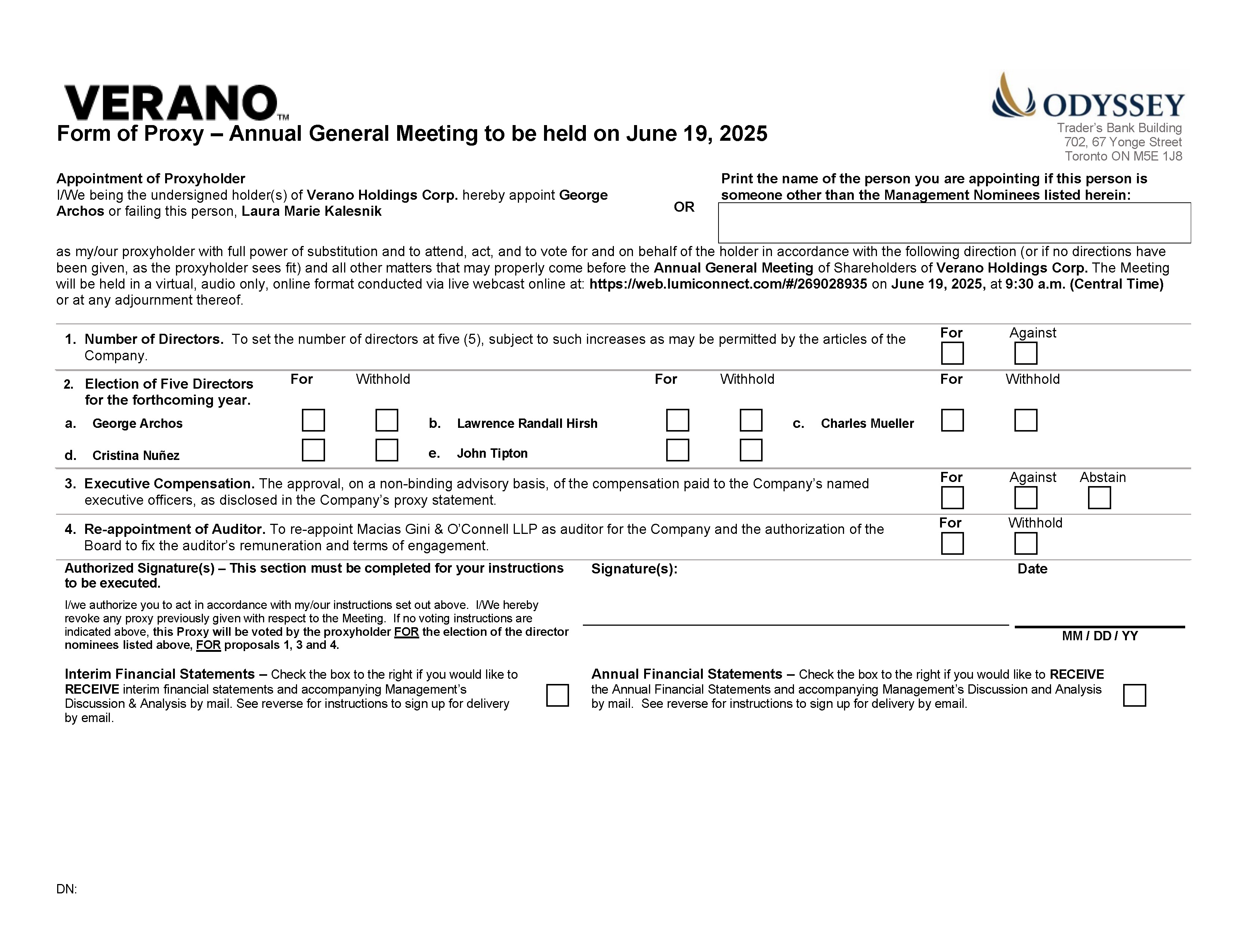 This management information circular and proxy statement (this “Proxy Statement”) contains information about the 2025 Annual General Meeting of Shareholders of Verano Holdings Corp. (the “Meeting”), to be held via live webcast on June 19, 2025 beginning at 9:30 a.m. (Central time), at https://web.lumiconnect.com/#/269028935. The Verano Holdings Corp. board of directors (the “Board”) is using this Proxy Statement to solicit proxies for use at the Meeting. Unless the context otherwise requires, references to “we,” “us,” “our,” “Company,” “Verano” or similar terms refer to Verano Holdings Corp., a British Columbia corporation, together with its subsidiaries. The mailing address of our principal executive office is 224 West Hill Street, Suite 400, Chicago, Illinois 60610, U.S.A.