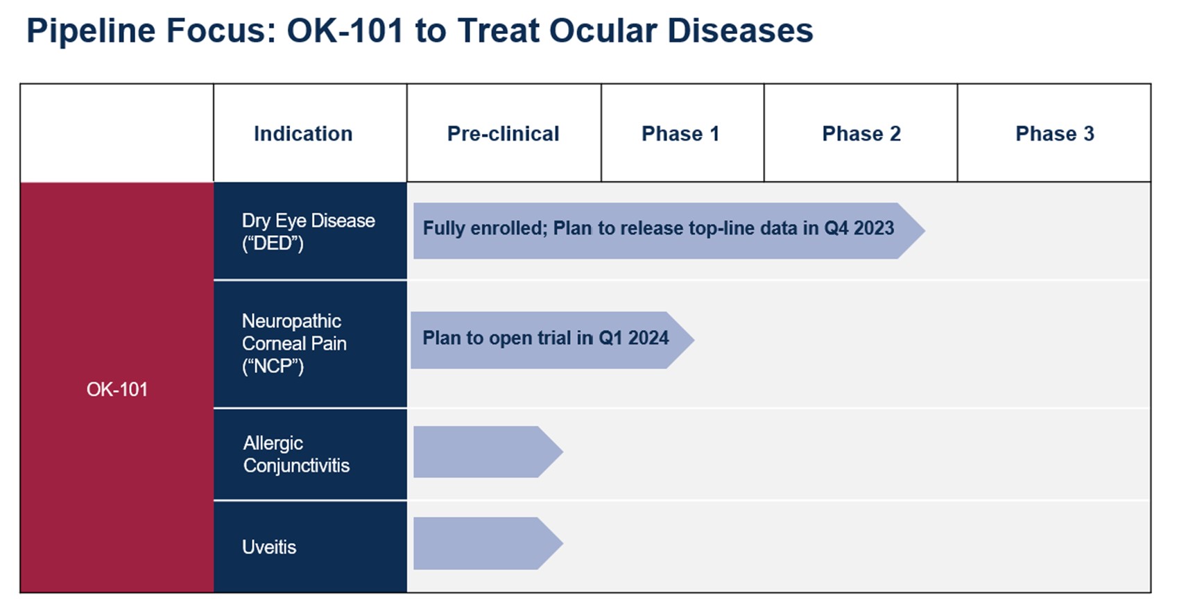 On July 28, 2023, we announced a new agreement with Tufts Medical Center to conduct a 40-patient open-label clinical trial evaluating the efficacy and safety of OK-101 in subjects with neuropathic corneal pain (“NCP”). The trial is being planned to start in Q4 2023. The Investigational New Drug (“IND”) application for NCP is planned to be filed in Q4 2023, with study enrollment planned to commence shortly after IND allowance by the FDA.