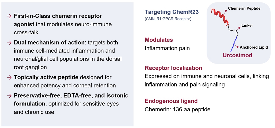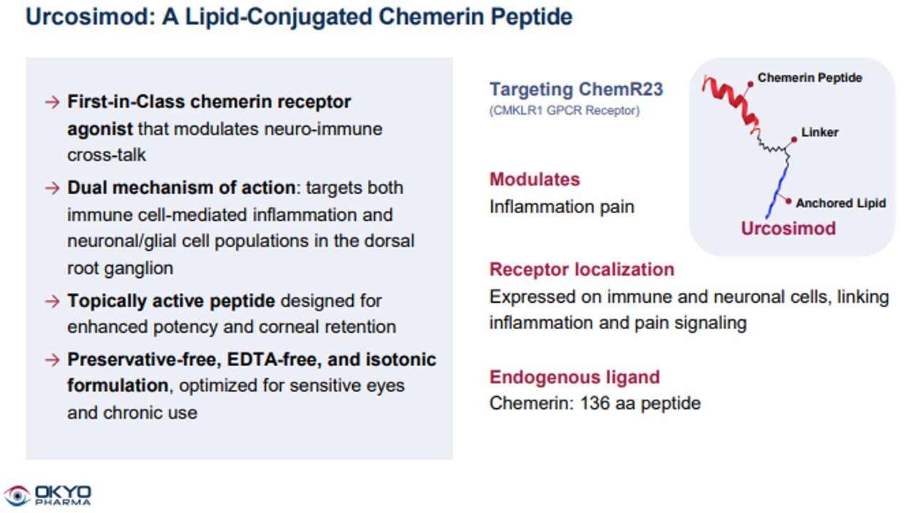 We are a clinical-stage biopharmaceutical company developing next-generation therapeutics to improve the lives of patients suffering from underserved rare ocular diseases. Our research program focuses on a novel G Protein-Coupled Receptor (“GPCR”), which we believe plays a key role in the pathology of corneal and anterior segment diseases of high unmet medical need. Our therapeutic approach involves targeting a specific member of this class of GPCR receptors called CMKLR1 (“ChemR23”) that is involved in the inflammatory and pain modulation pathways that drive these conditions. Our lead clinical product candidate, urcosimod (formerly called OK-101), is a lipidated peptide designed to specifically bind to ChemR23 and block its role in producing ocular pain and inflammation.
